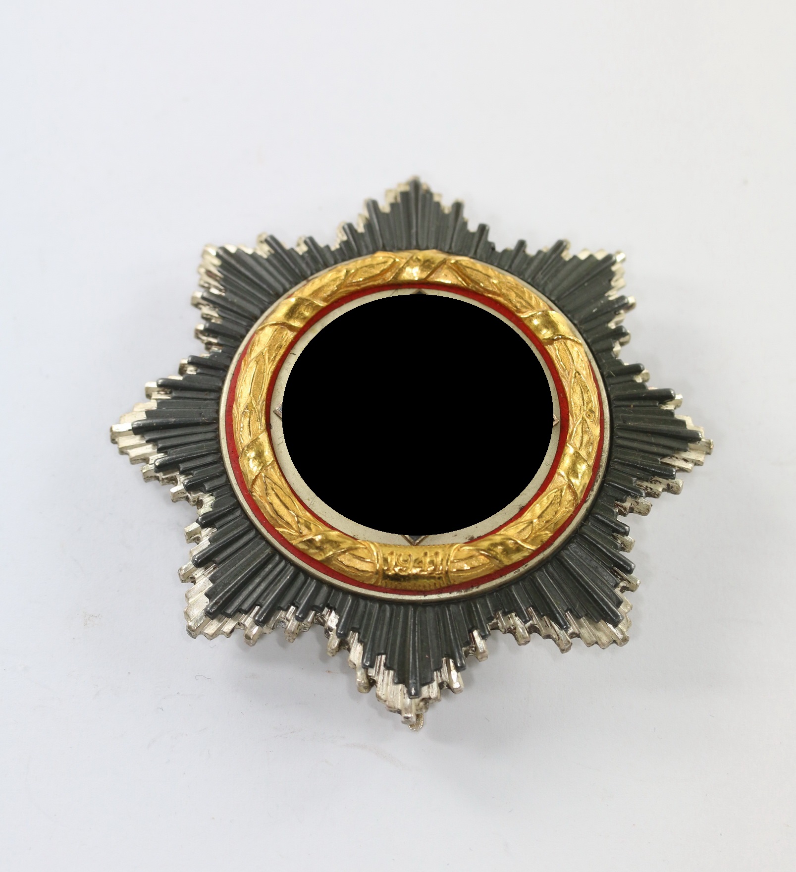 Leichtes Cupal Stück (51,8 g), excellenter, absolut ungetragener Zustand. Die Emaille ohne Fehler. Der Spiegel mit vollständiger, frostiger Versilberung, der Kranz mit vollständiger, strahlender Vergoldung. Der Strahlenkranz mit vollständiger Tönung, die Grundplatte mit vollständiger Versilberung. Ohne Hersteller, aber eine bekannte Variante der Firma C.E. Juncker, Berlin. Siehe Dietrich März, Das Deutsche Kreuz.