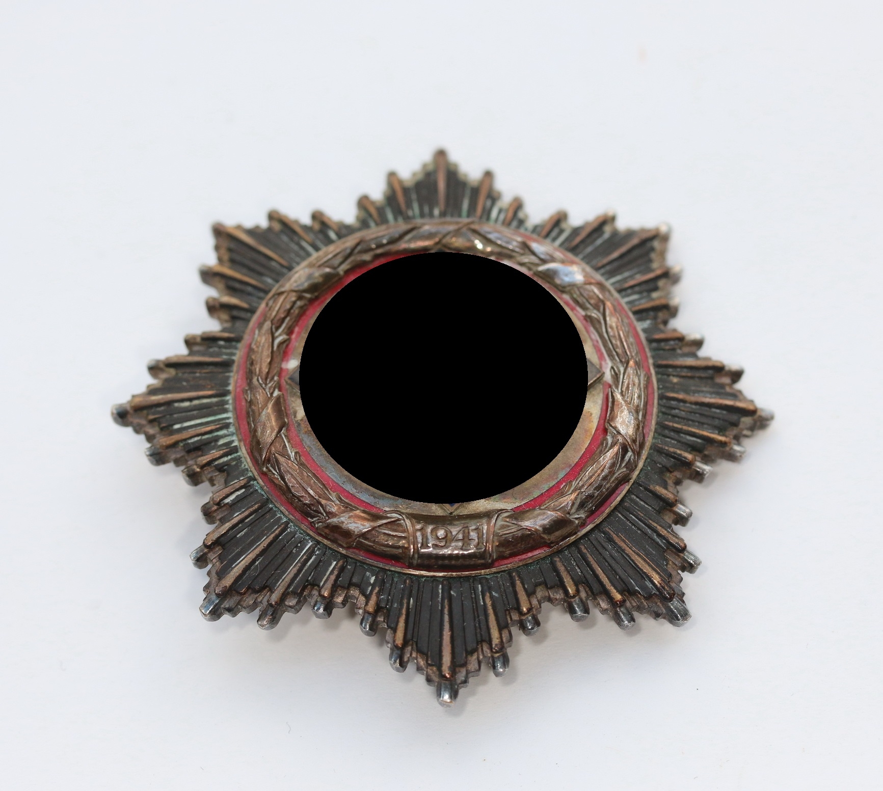 Schweren Tombak Stück (65,8 g), sehr guter, nur leicht getragener Zustand. Die Emaille mit leichten Kratzern, aber ohne Chips, oder Ausbrüche. Der Spiegel mit fast vollständiger Versilberung und leichter Patina, der Kranz mit vollständiger Versilberung mit Patina. Der Strahlenkranz mit noch schöner Tönung, die Grundplatte mit vollständiger Versilberung, beides mit Patina. Ohne Hersteller, aber eine bekannte Variante der Firma Deschler & Sohn, München. Siehe Dietrich März, Das Deutsche Kreuz, S. 100 – 105. Die einzige Variante des Deutschen Kreuzes, die es nur in der Silber Variante gibt!
