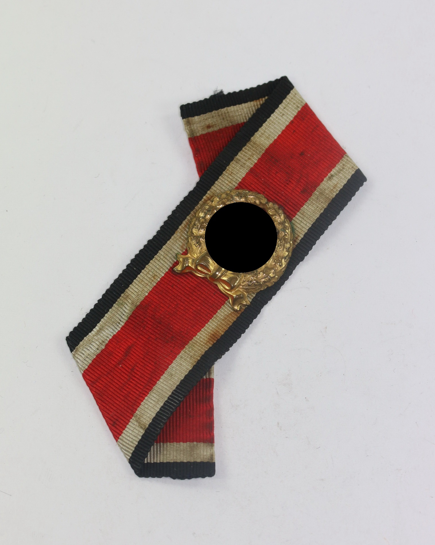 Buntmetall vergoldet, sehr guter, leicht getragener Zustand. Hohl geprägter Eichenlaubkranz, das Hakenkreuz massiv geprägt und separat eingesetzt. Ein Splint fehlt(!), sonst vollständig und unversehrt. Noch auf den getragenen original Band.