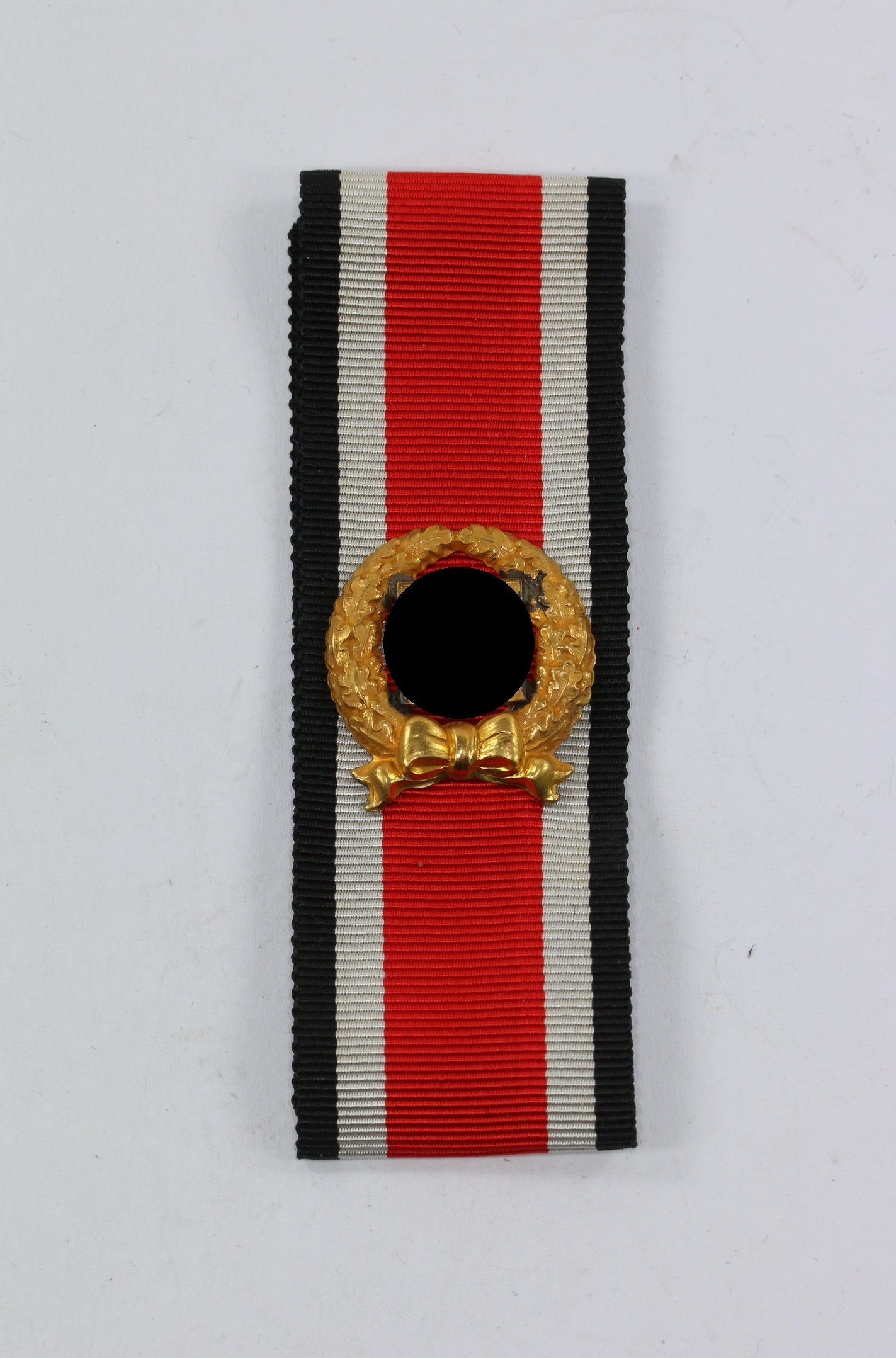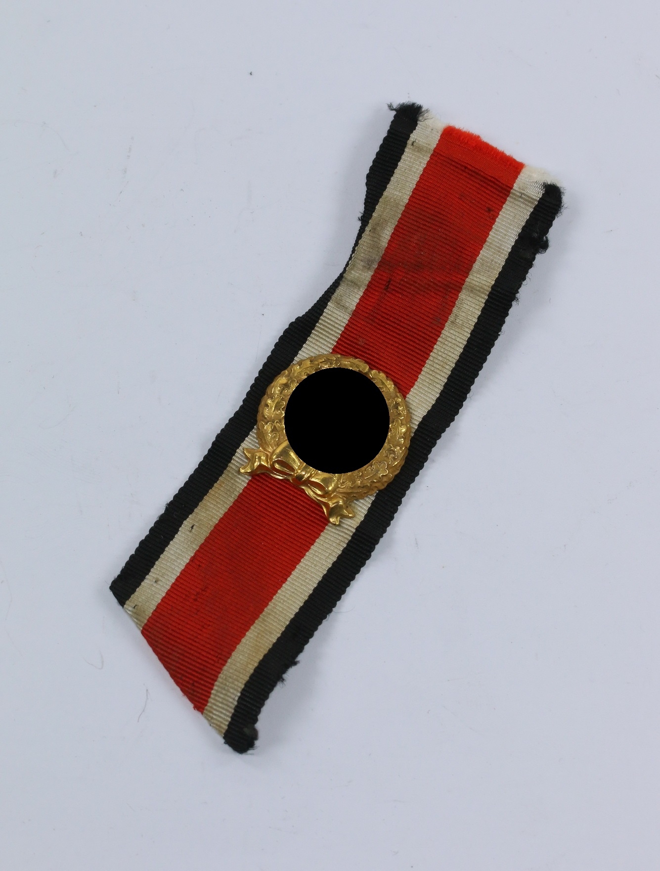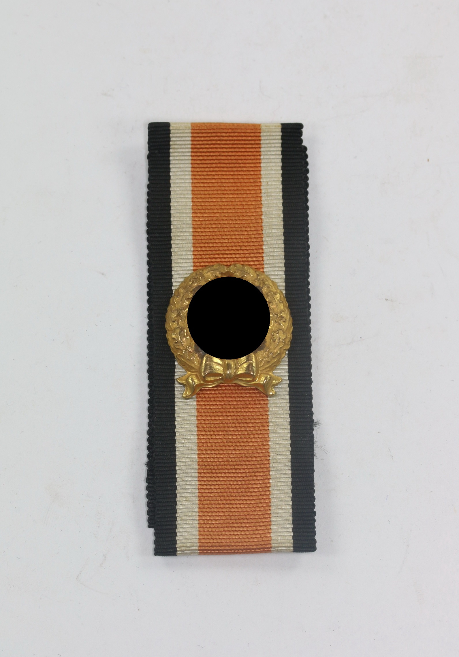 Buntmetall vergoldet, sehr guter, nur leicht getragener Zustand. Mit vollständiger Vergoldung. Hohl geprägter Eichenlaubkranz, das Hakenkreuz massiv geprägt und separat eingesetzt. Zwei Splinte fehlen(!), sonst vollständig und unversehrt. Noch auf den originalen, getragenen Band.