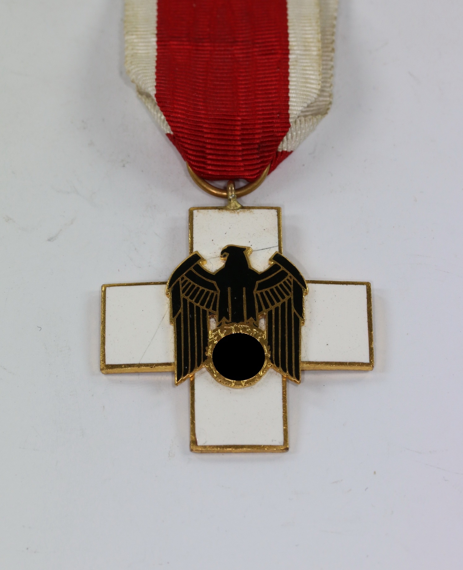 Buntmetall vergoldet und emailliert, sehr guter, leicht getragener Zustand. Die weiße Emaille mit zwei feinen Rissen, aber ohne Ausbrüche. Der Adler separat aufgelegt. Ohne Hersteller, aber eine bekannte Variante der Firma Godet & Co., Berlin.