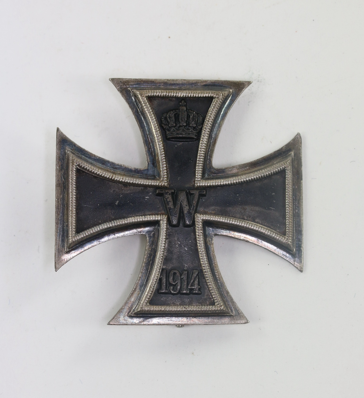 Der Nadelhaken abgebrochen(!), sonst sehr guter, nur leicht getragener Zustand. Der Kern mit fast vollständiger Schwärzung. Der Rahmen mit Patina. Ohne Hersteller, aber eine bekannte Variante des Herstellers Victoria. An typischer, dünner Drahtnadel. Magnetisch. Säte Variante um 1917/18.