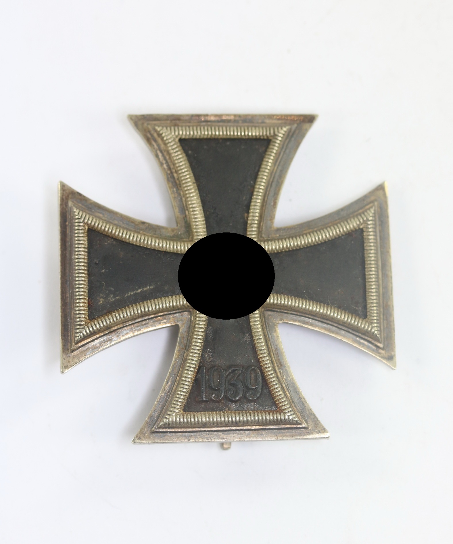 Der Nadelbock zeitgenössisch nachgelötet(!), sonst sehr guter, leicht getragener Zustand. Der Kern mit fast vollständiger Schwärzung, der Rahmen mit leichter Patina. Auf der Nadel die Hersteller markierung „65 für die Firma Klein & Quenzer A.G., Oberstein. Magnetisch.