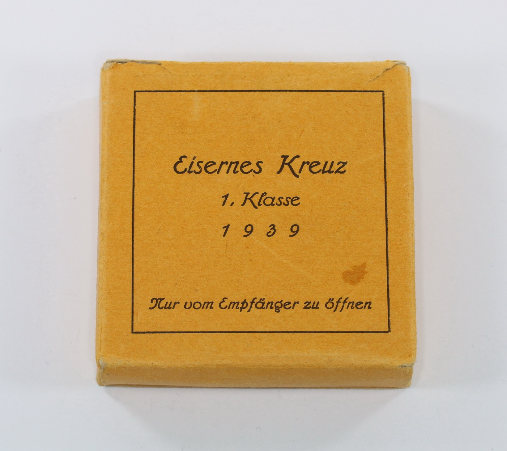 Sehr guter, nur leicht gebrauchter Zustand. Vollständig mit allen Laschen, auch den kleinen Innenlaschen. Auf den Karton der Aufdruck „Eisernes Kreuz 1. Klasse 1939 Nur vom Empfänger zu öffnen“, an der Seite der Hersteller Aufdruck „B.H. Mayer, Pforzheim“ (26).