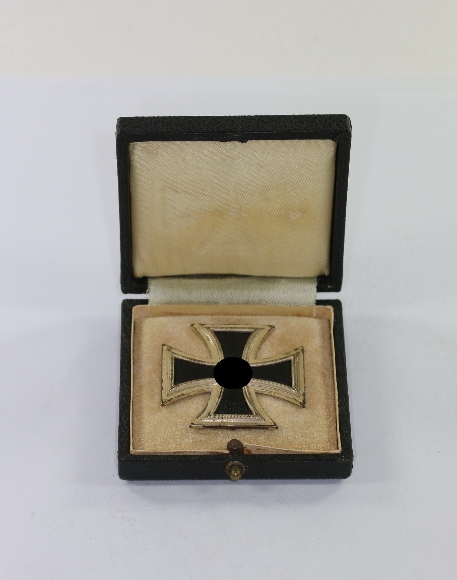 Das Etui in einen sehr guten, nur leicht gebrauchten Zustand. Auf den gewölbten Deckel mit eingeprägten Eisernen Kreuz.