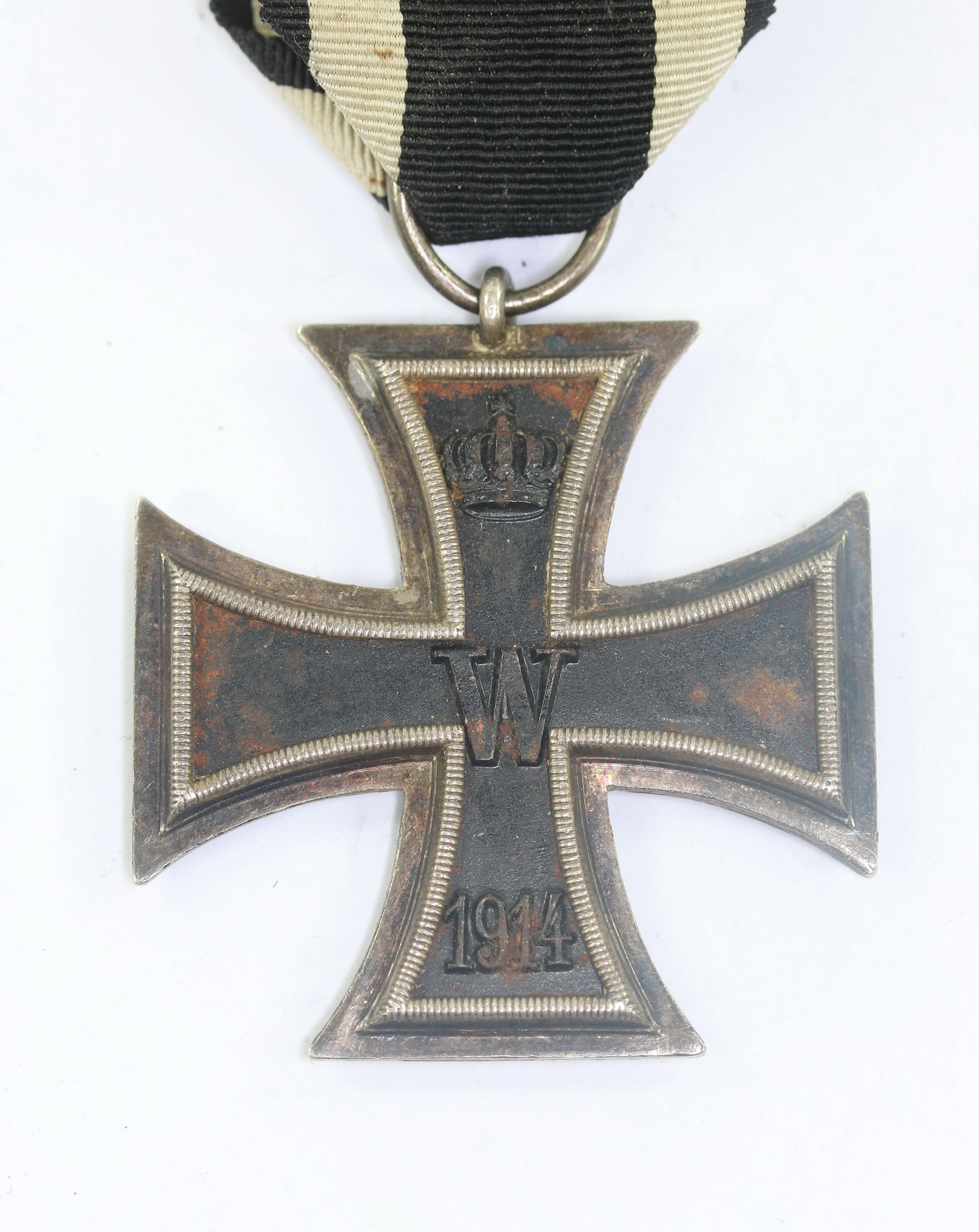 Sehr guter, leicht getragener Zustand. Der Kern mit fast vollständiger Schwärzung, leicht flugrostig. Der Rahmen mit Patina. Im bandring die Hersteller Markierung „LV 7“ für Lieferungsverband für Eiserne Kreuze 7. Magnetisch. Mit origunalen Trageband.