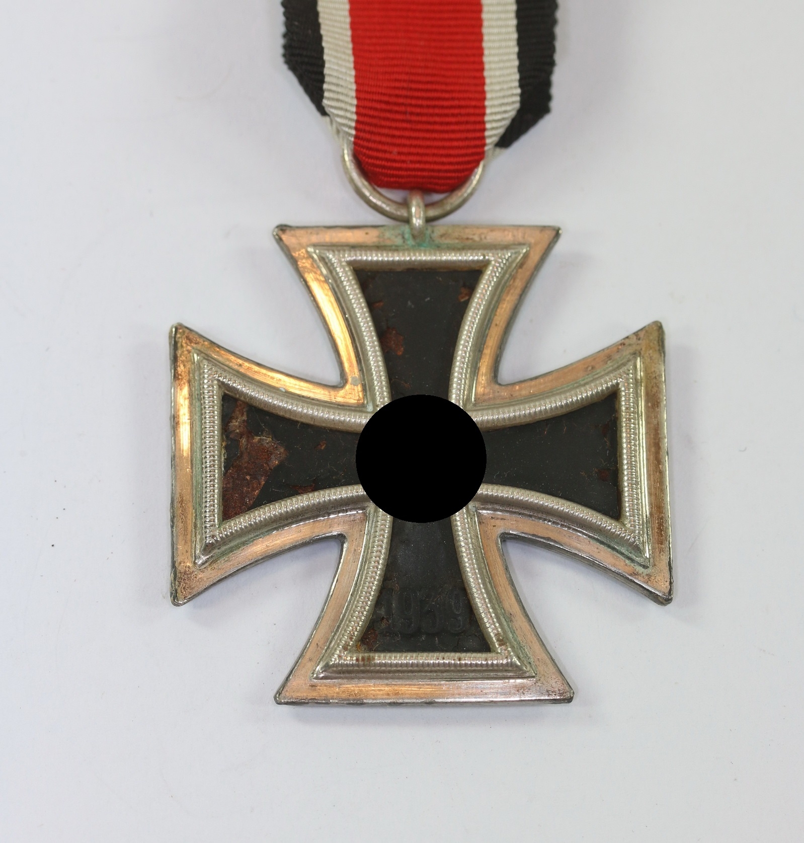 Sehr guter, leicht getragener Zustand. Der Kern mit leichten Farbverlusten, sonst mit sehr schöner Schwärzung, der Rahmen mit leichter Patina. Mit Hersteller „24“ (etwas verschlagen) für die Arbeitsgemeinschaft der Hanauer Plakettenhersteller, Hanau. Typisches Kreuz mit überbreiten(!) Rahmen. Magnetisch.