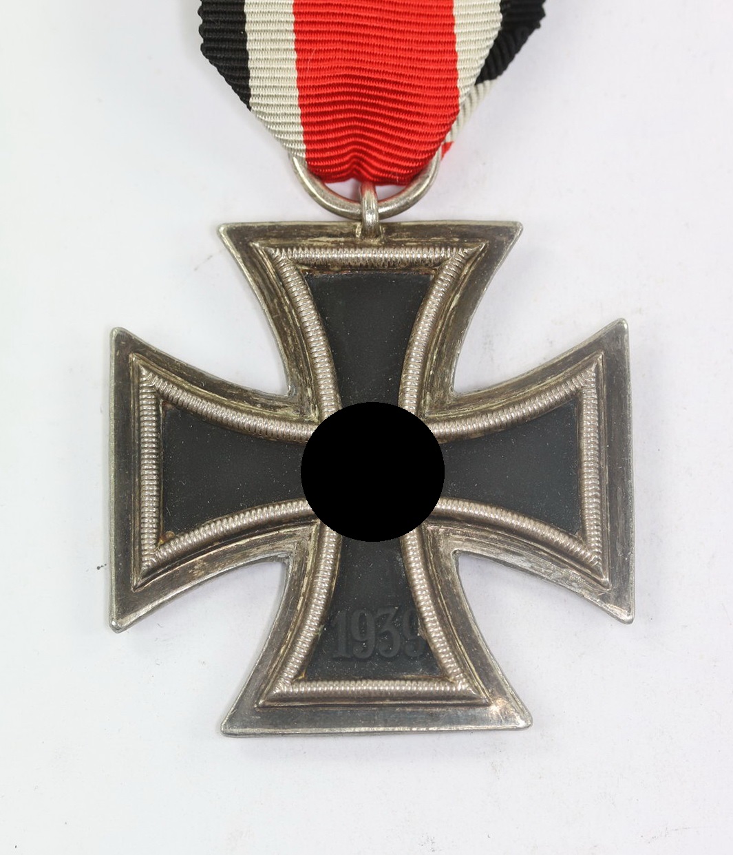 Das Eiserne Kreuz in einen sehr guten, nur leicht getragenen Zustand. Der Kern mit fast vollständiger Schwärzung, der Rahmen mit Patina. Im Bandring die Hersteller Markierung „24“ für die Arbeitsgemeinschaft der Hanauer Plakettenhersteller aus Hanau. Typisches Kreuz mit überbreiten(!) Rahmen. Magnetischer Kern. Mit originalem Trageband.