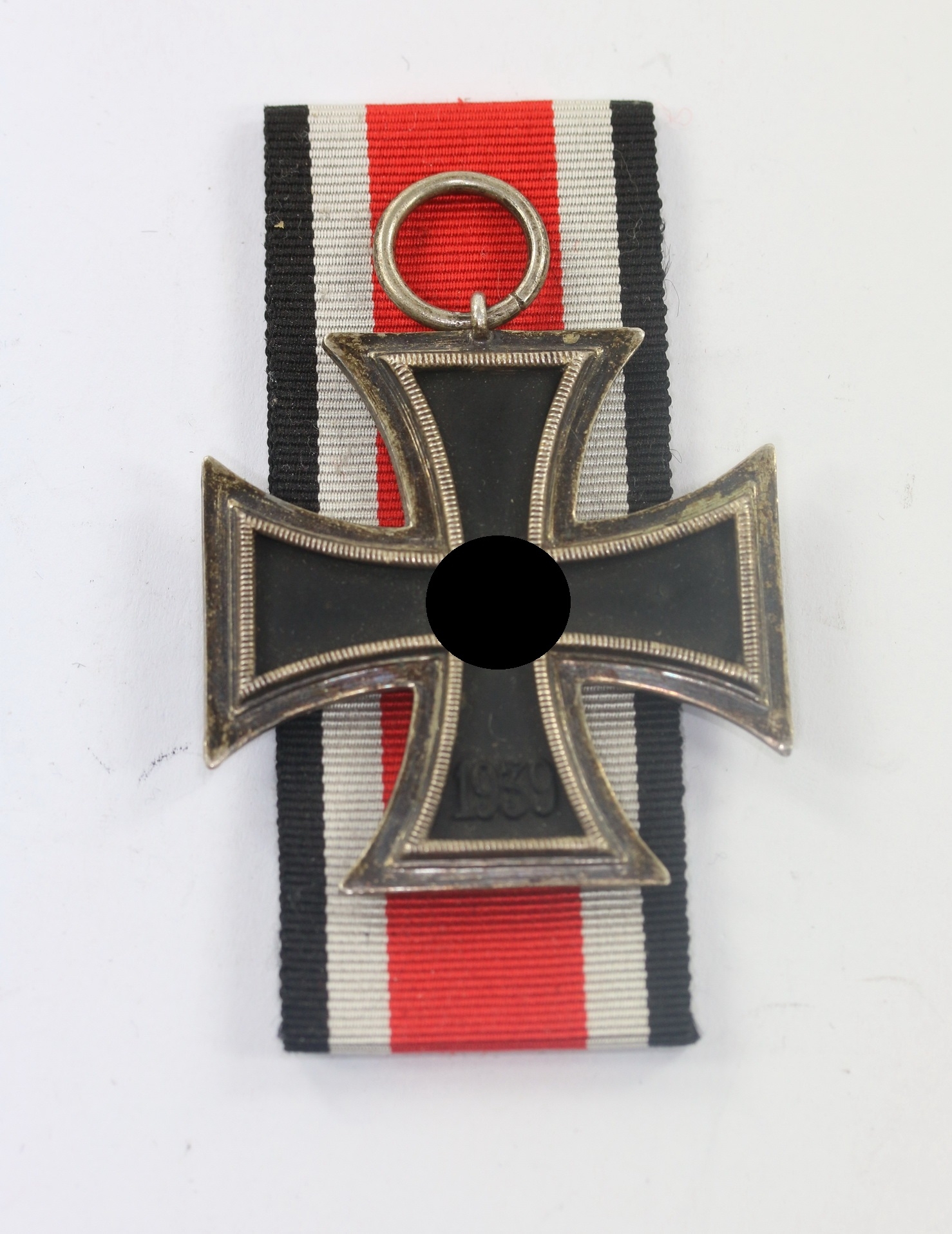 Sehr guter, nahe zu ungetragener Zustand. Der Kern mit vollständiger Schwärzung, die Zargen frostig, die Kanten poliert. Mit leichter Patina. Ohne Hersteller, aber eine bekannte Variante, die als „Intermediat Schinkel“ bekannt ist. Mit typischen, feinen Hakenkreuz. Magnetisch. Mit ungetragenen Band in voller Verleihungslänge.
