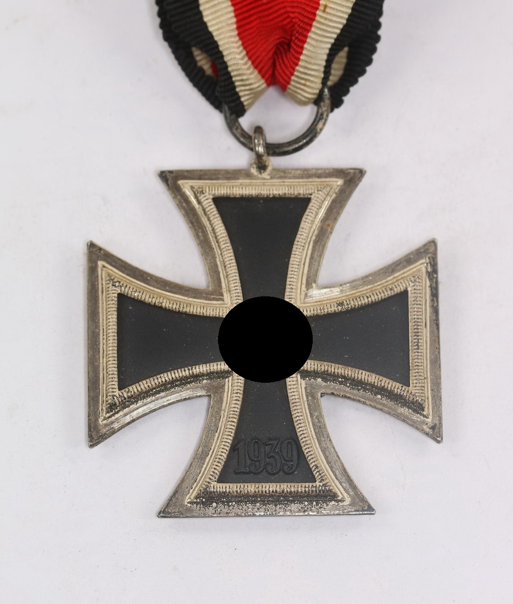 Das Eiserne Kreuz in einen sehr guten, nahezu ungetragenen Zustand. Der Kern mit vollständiger Schwärzung, die Zargen frostig, die Kanten poliert. Ohne Hersteller Markierung, aber eine bekannte Variante der Firma Rudolf Wächtler & Lange aus Mittweida (100). Das Kreuz mit magnetischem Kern. Mit originalen Tragebband.