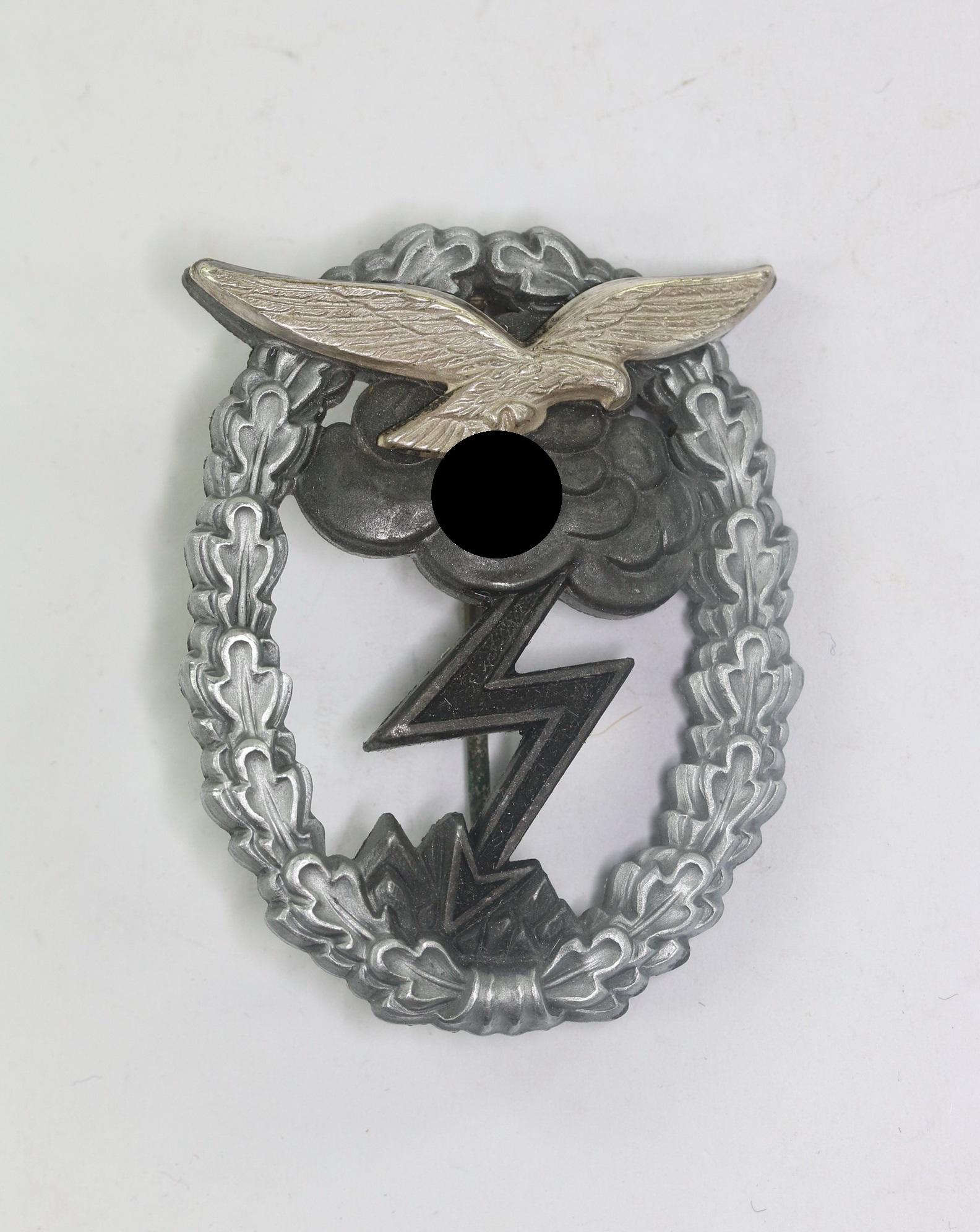 Zink,excellenter, ungetragener Zustand. Mit separat aufgenieteten Adler aus Buntmetall. Ohne Hersteller, aber eine bekannte Variante der Firma Hammer & Söhn, Geringswalde. Sieh GCA-Datenbank.