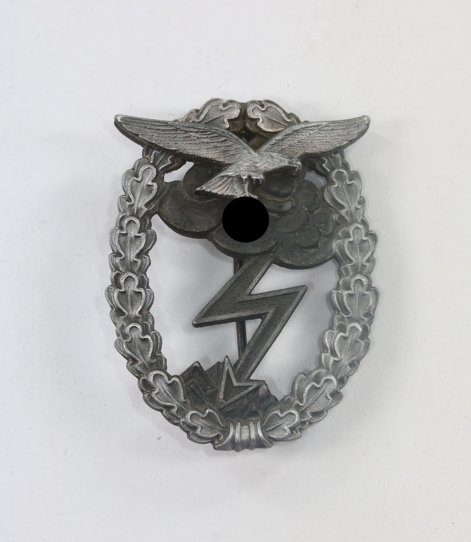 Zink, sehr guter, nahe zu ungetragener Zustand. Der Adler aufgesetzt. Adler und Kranz mit fast vollständiger Versilberung. Der Rest mit vollständiger, dunkler Tönung. Mit Hersteller „G.B.“ für die Firma Gustav Brehmer, Markneukirchen. Siehe GCA-Datenbank. Mit typisch Nadelsystem.