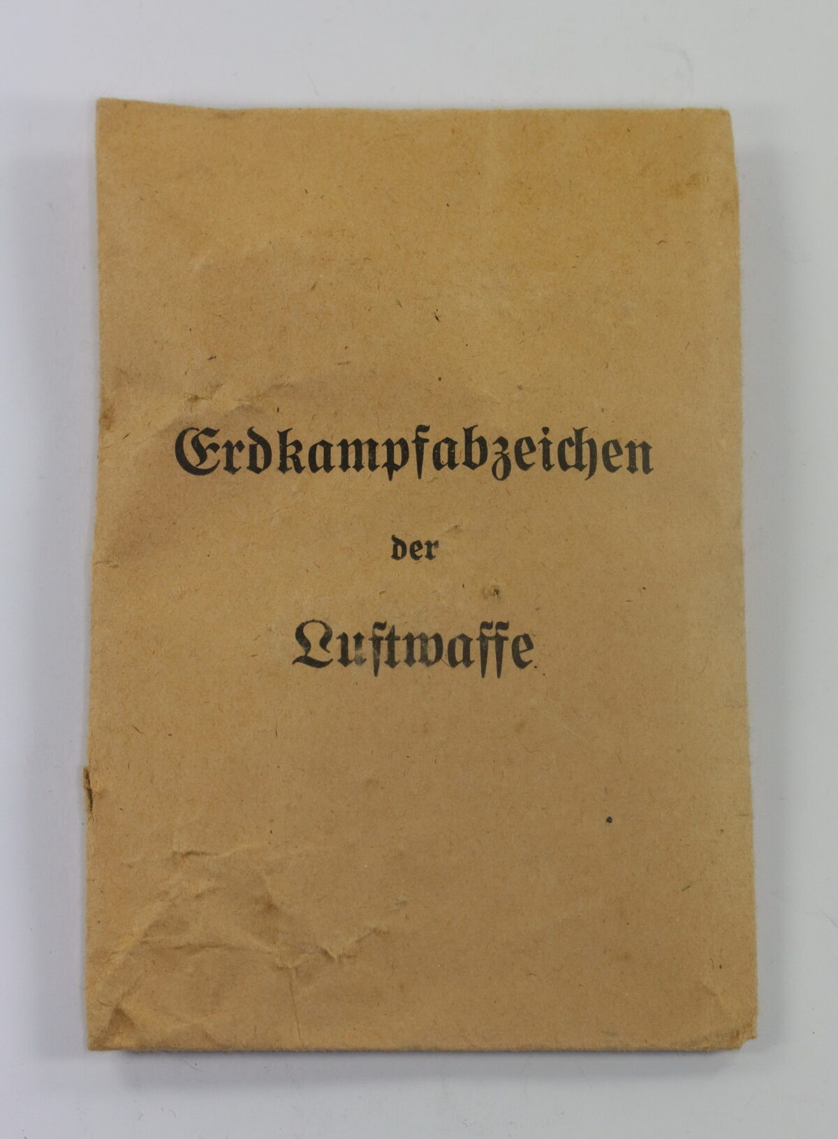 Die Tüte in einen sehr guten, nur minimal gberauchten Zustand. Auf der Vorderseite der Aufdruck „Erdkampfabzeichen der Luftwaffe“, rückseitig der passende Hersteller Aufdruck „G.H. Osang Dresden A1“. Maße ca. 85 x 125 mm. Aus Hortfund!