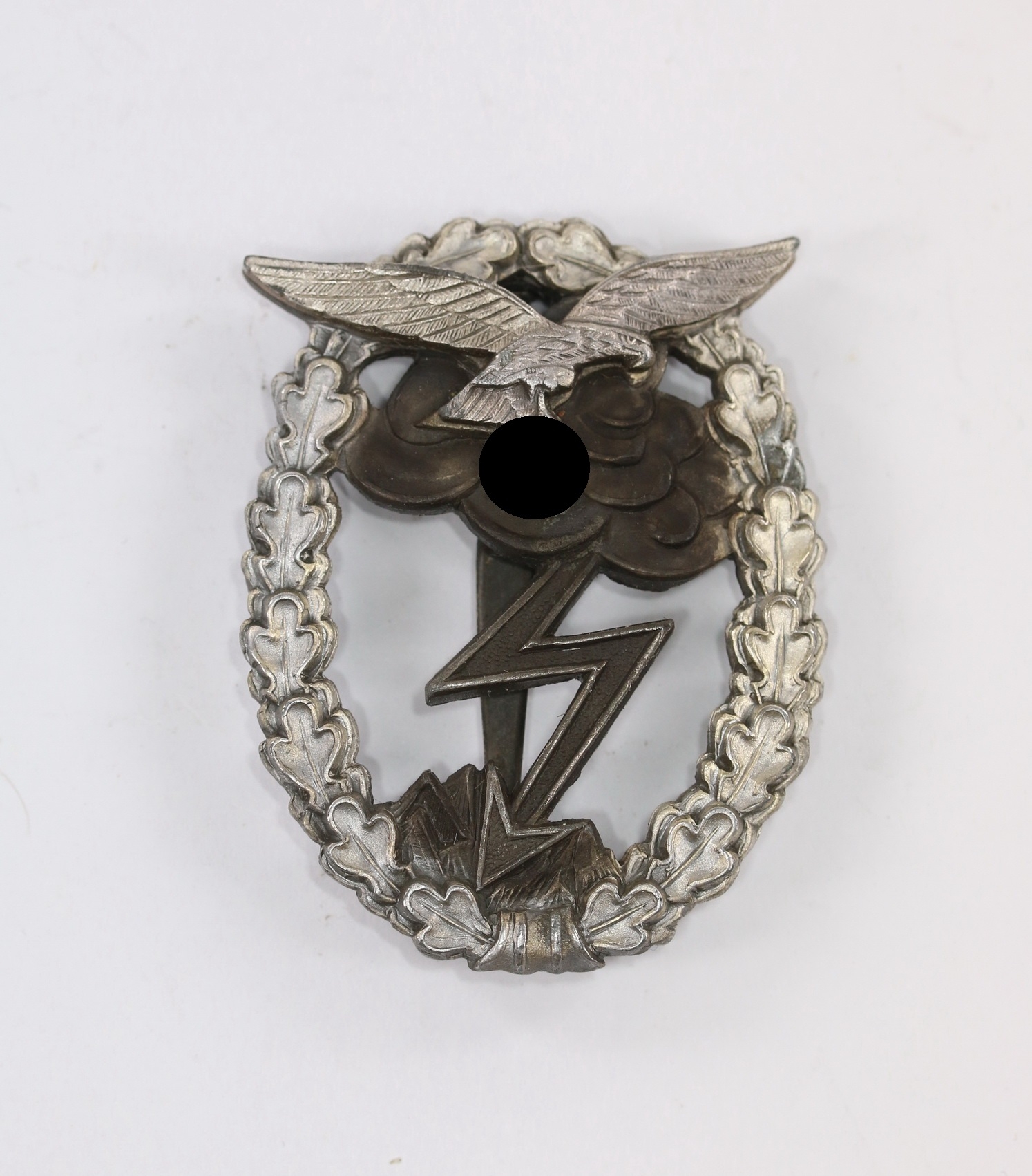 Zink, excellenter, ungetragener Zustand. Der Buntmetall Adler separat mit drei nieten aufgesetzt. Adler und Kranz mit vollständiger Versilberung. Hakenkreuz und Kanten poliert. Der Rest mit vollständiger, dunkler Tönung. Mit Hersteller „M.u.K. 5“ für die Arbeitsgemeinschaft Metalle und Kunststoffe aus Gablonz. Siehe GCA-Datenbank. Ganz frühes, sehr seltenes Abzeichen, mit noch vollständig lesbarer Hersteller Bezeichnung. Wird bei späteren Stücken mit der Zeit immer schlechter lesbar. Sehr seltene Variante in excellenter Erhaltung!