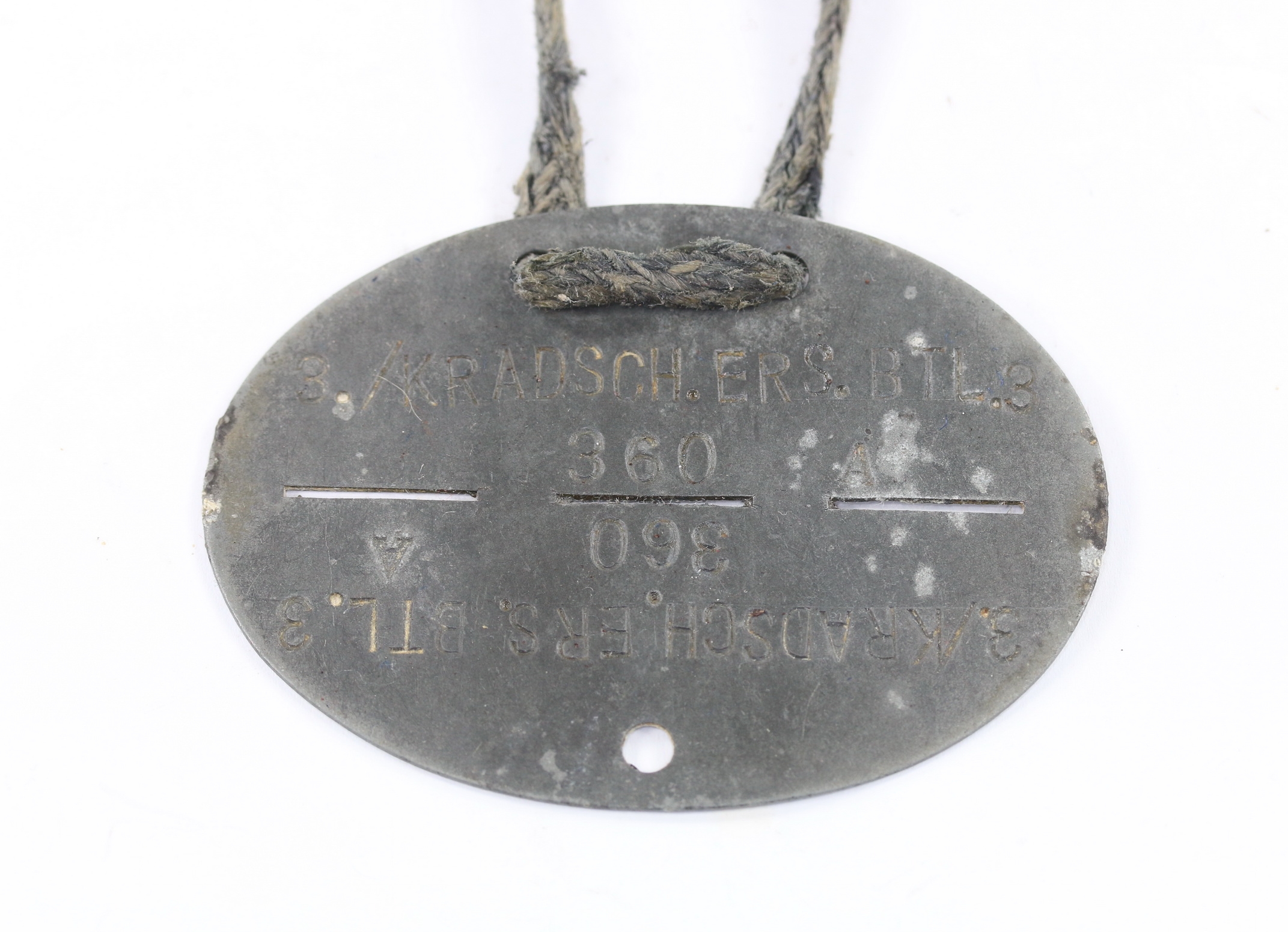 Zink, sehr guter, leicht getragener Zustand. „3./Kradsch. ERS. BTL. 3“ für 3. Kompanie Kradschützen Ersatz Bataillon 3. Mit originalen Tragebad.