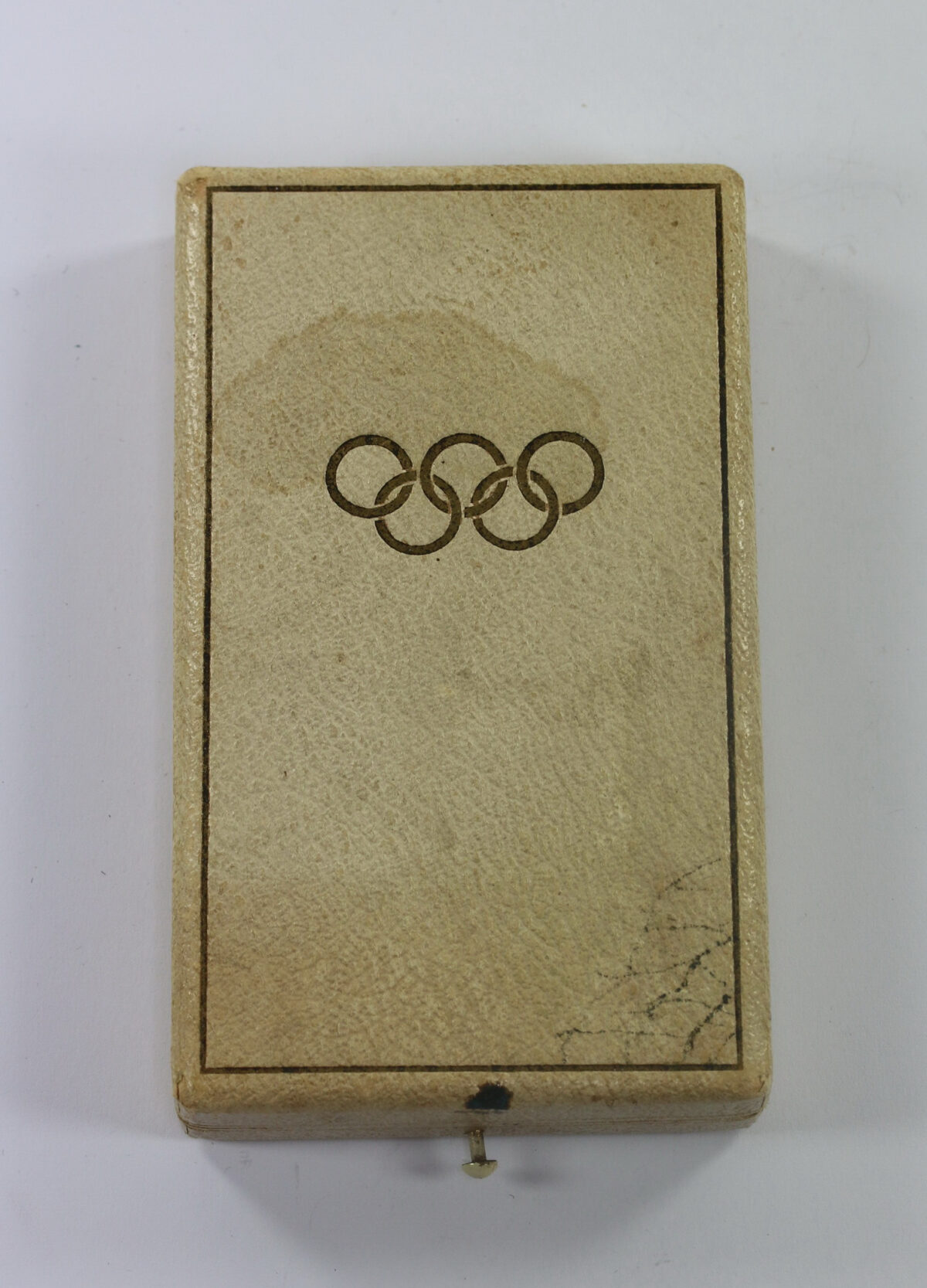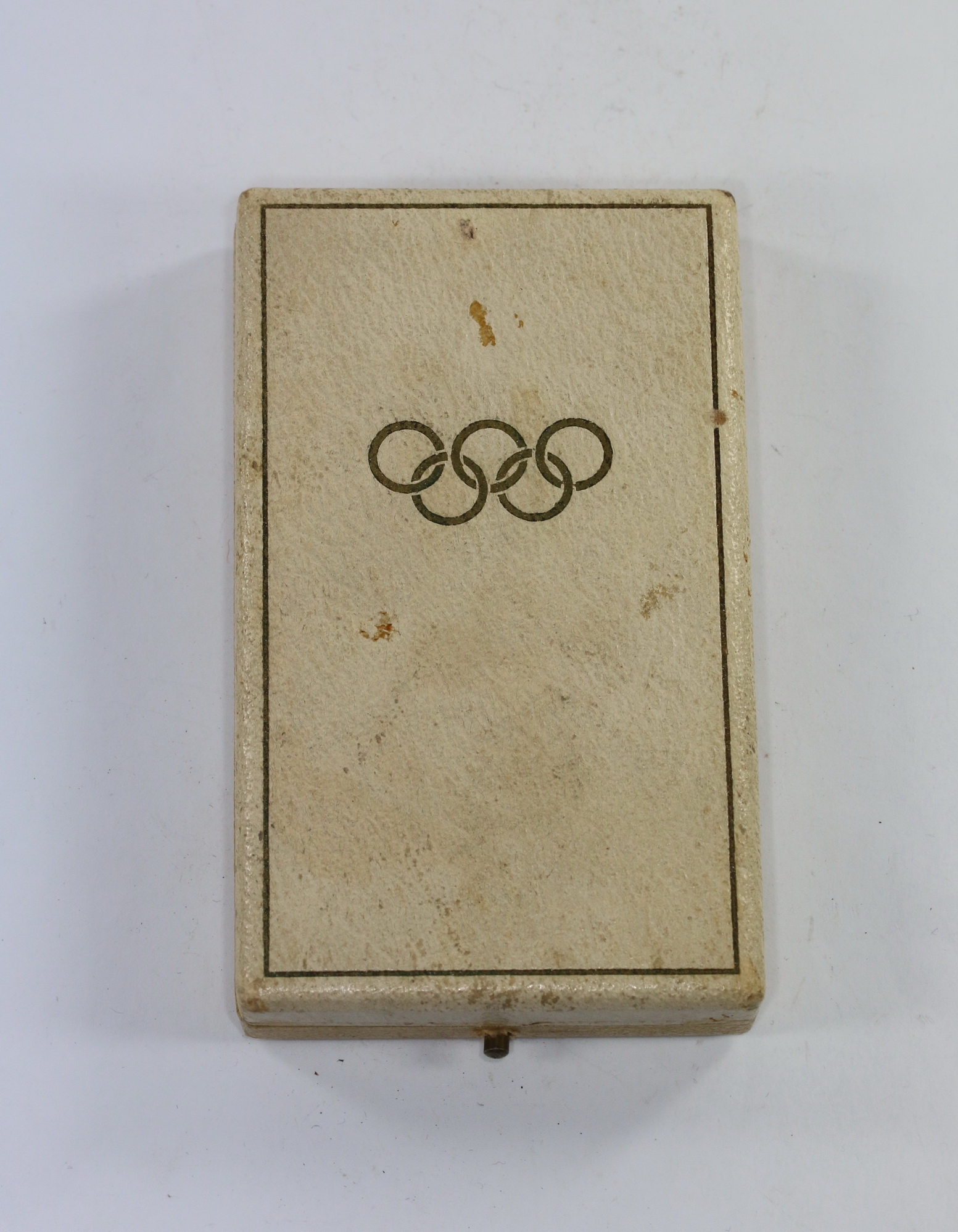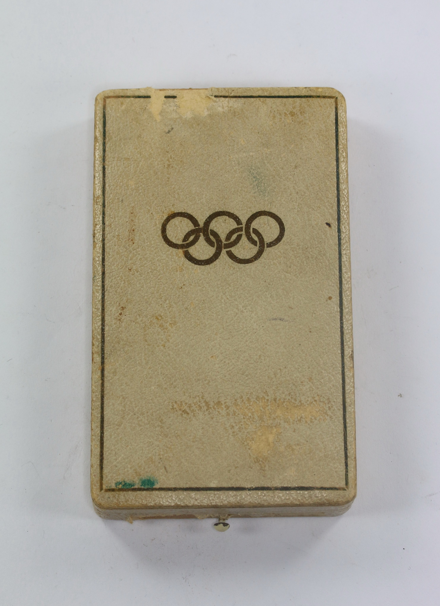 Sehr guter, leicht gebrauchter Zustand. Auf den Deckel in Gold in Olympischen Ringe, außen mit Goldkante. Innen mit Samt und Seide.