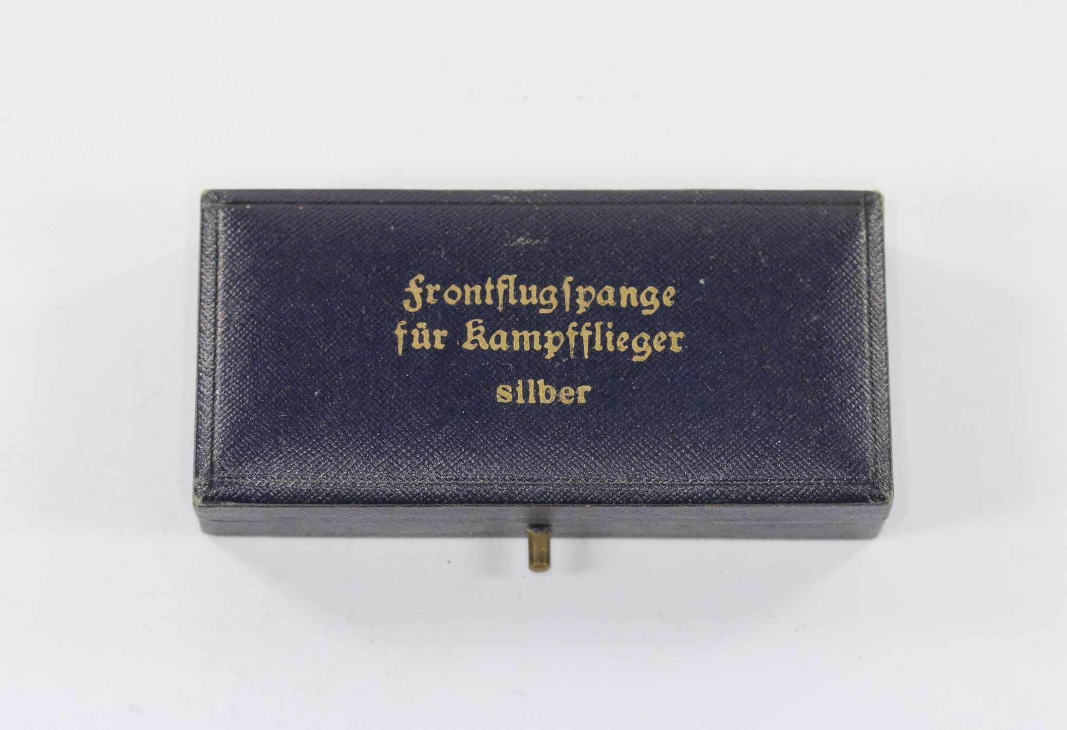 Sehr guter, nur minimal gebrauchter Zustand. Auf den Deckel in Gold eingeprägt „Frontflugspange für Kampfflieger silber“. Etui aus der mittleren Phase des 2. Weltkrieges. Passend für alle Buntmetall und Zink Spangen.