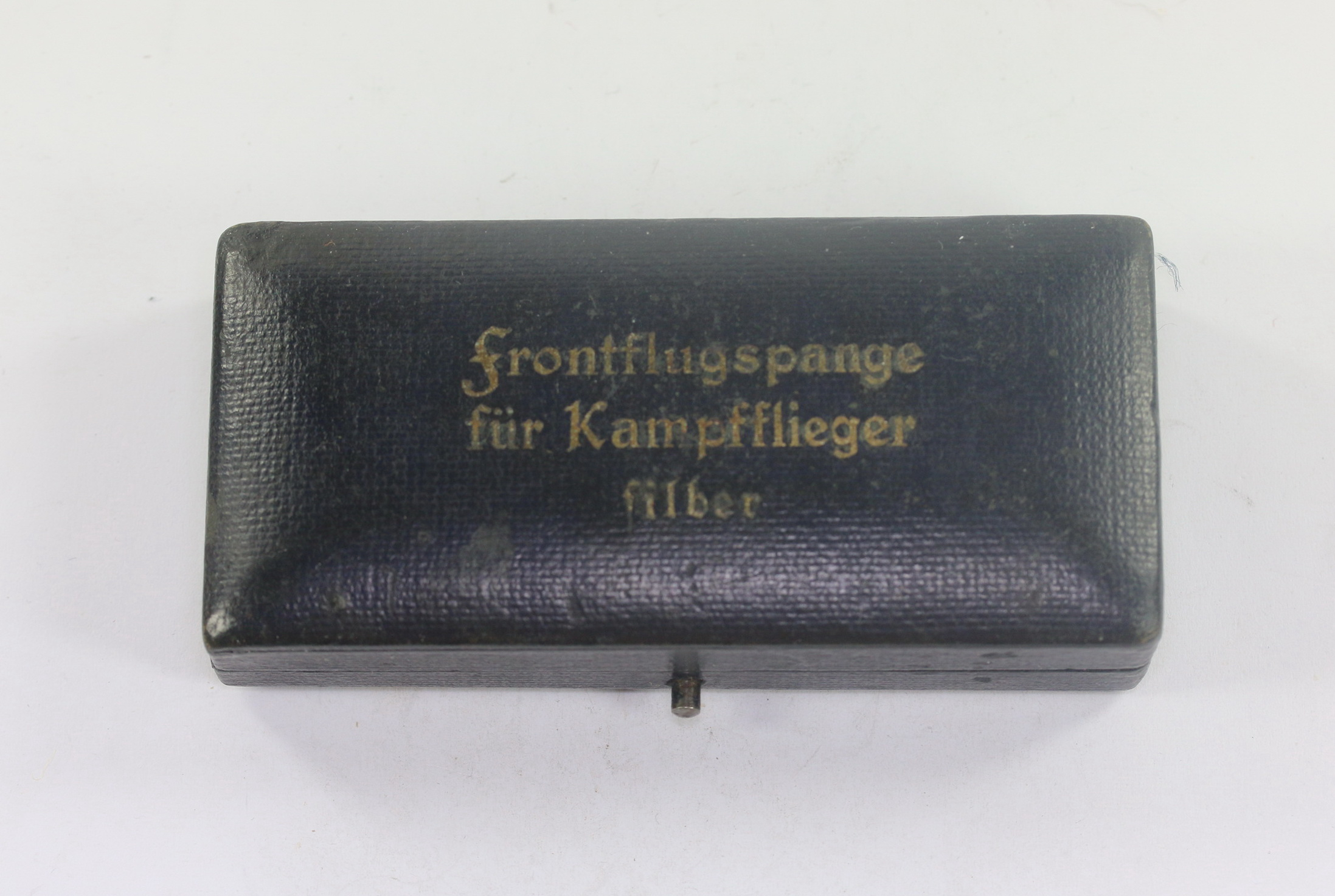 Sehr guter, nur minimal gebrauchter Zustand. Auf den Deckel in Gold eingeprägt „Frontflugspange für Kampfflieger silber“. Frühes Etui passend für alle Buntmetall Spangen.