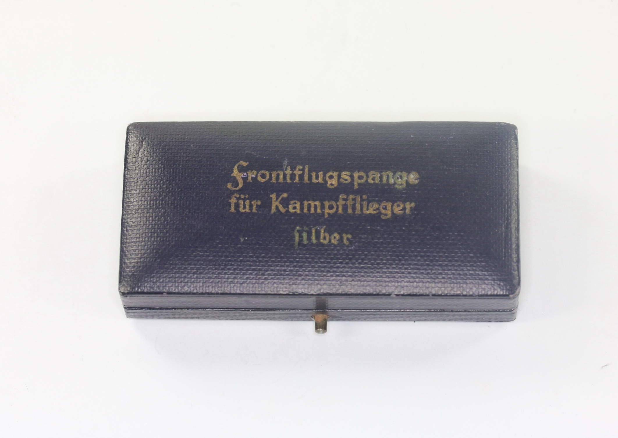 Sehr guter, nur minimal gebrauchter Zustand. Auf den Deckel in Gold eingeprägt „Frontflugspange für Kampfflieger silber“. Frühes Etui passend für alle Buntmetall Spangen.