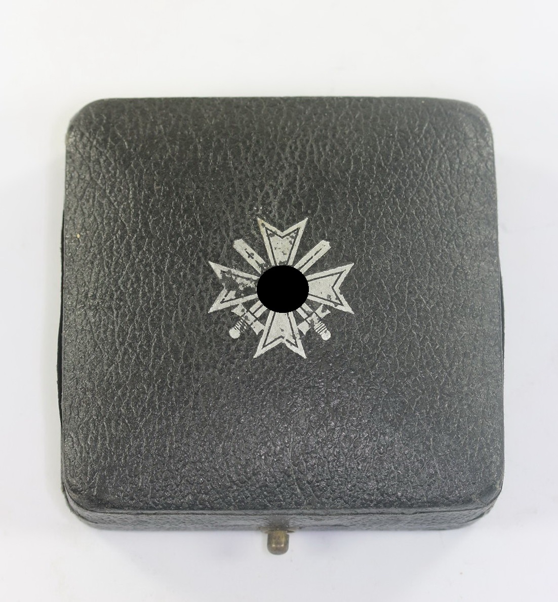 Etui für ein Kriegsverdienstkreuz 1. Klasse mit Schwertern, mit Abbildung der Auszeichnung mit Hakenkreuz