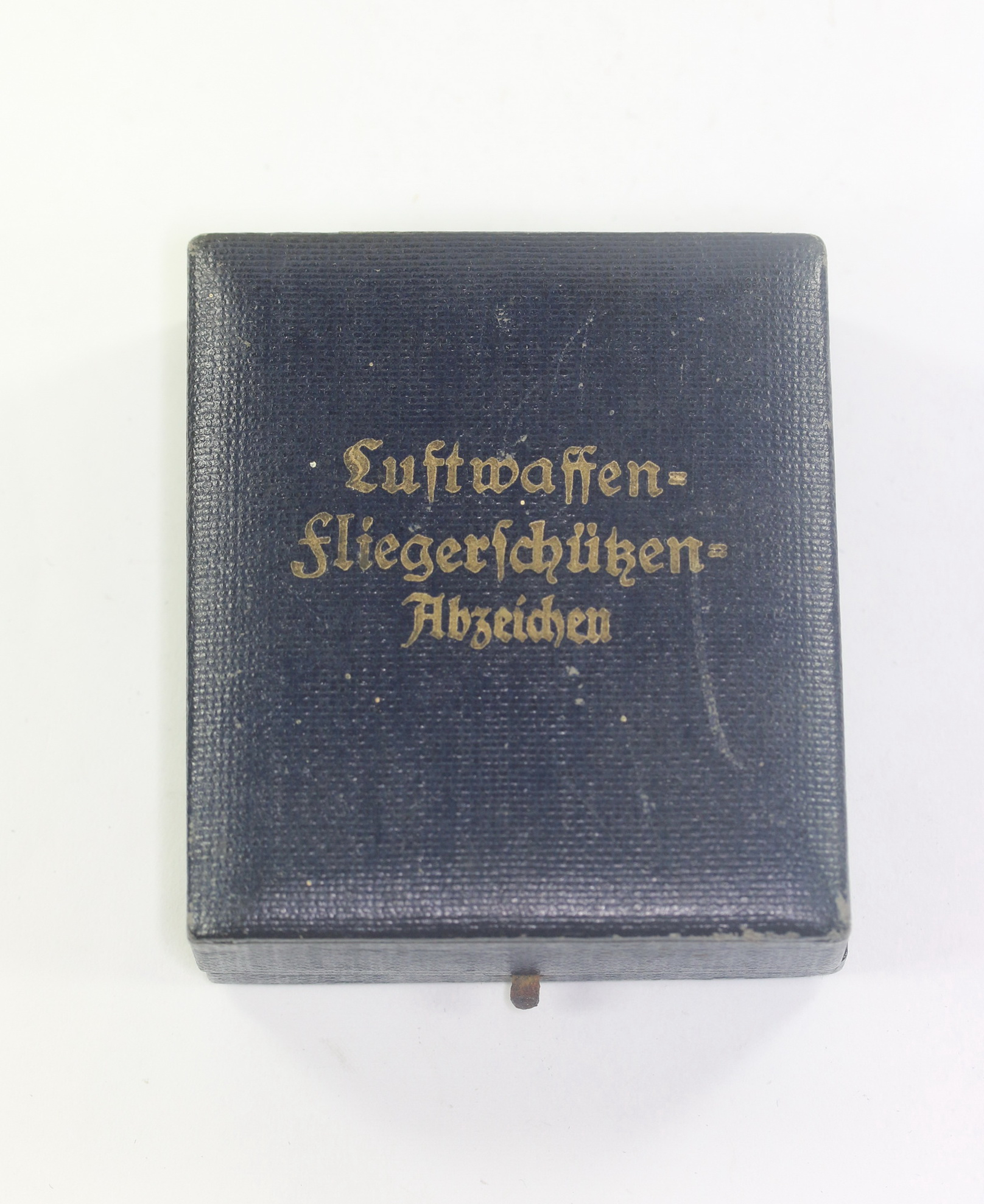 Sehr guter, nur leicht gebrsuchter Zustand. Auf den deckel in Gold eingeprägt „Luftwaffen Fliegerschützen Abzeichen“. Innen mit Samt und Seide.