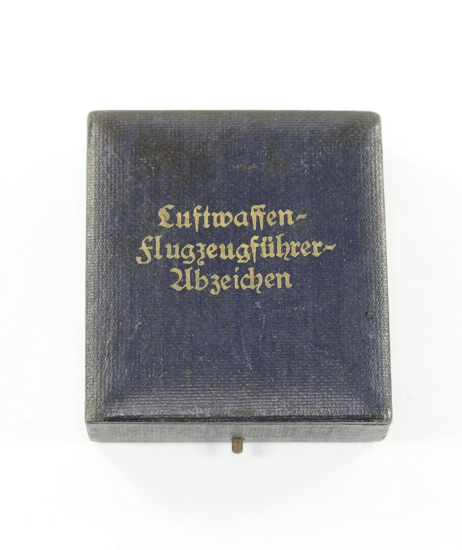 Sehr guter, nur leicht gebrauchter Zustand. Auf den Deckel in Gold eingeprägt „Luftwaffen Flugzeugführerabzeichen“. Innen mit Samt und Seide. Etui aus der mittleren Phase des Krieges, geeignet für alle massiven Buntmetall Abzeichen.