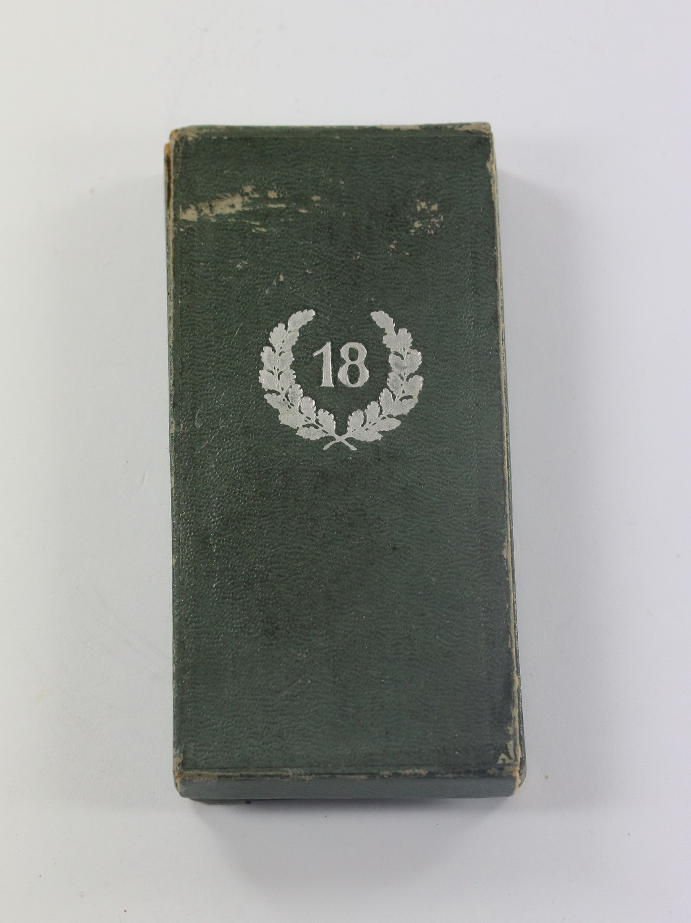 Eine Seite am Deckel fehlt(!), sonst sehr guter, etwas gebrauchter Zustand. Auf den Deckel in Silber eine „18“ (18 Jahre) im Eichenlaubkranz.