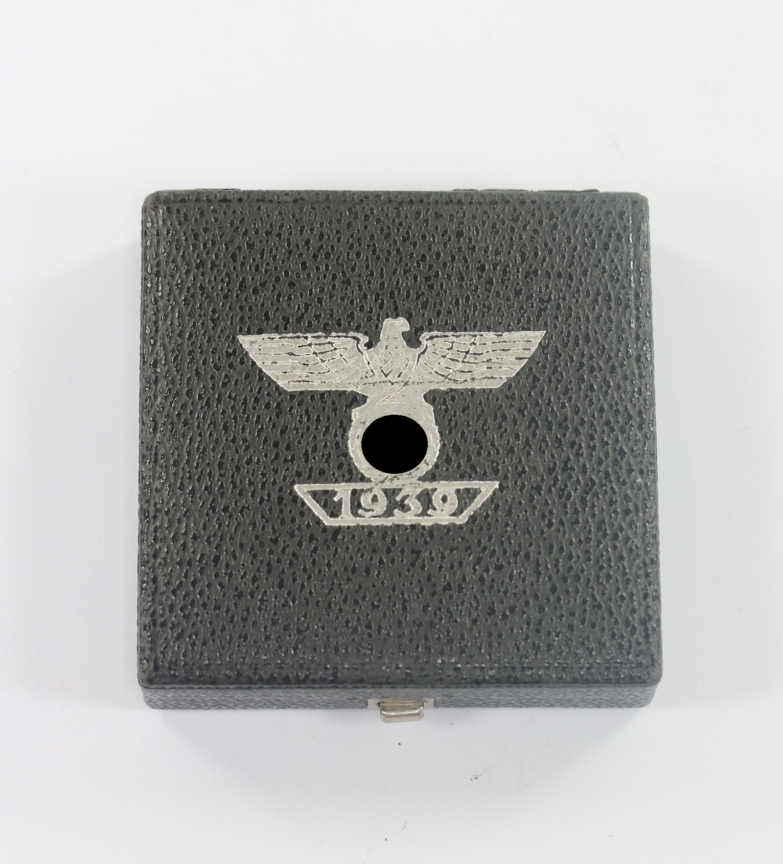 Sehr guter, nur leicht gberauchter Zustand. Auf den Deckel mit in Silber eingeprägter Abbildung der Auszeichnung. Innen mit Samt und Seide. Passent für alle Buntmetall Spangen. Mit eckingen Drücker