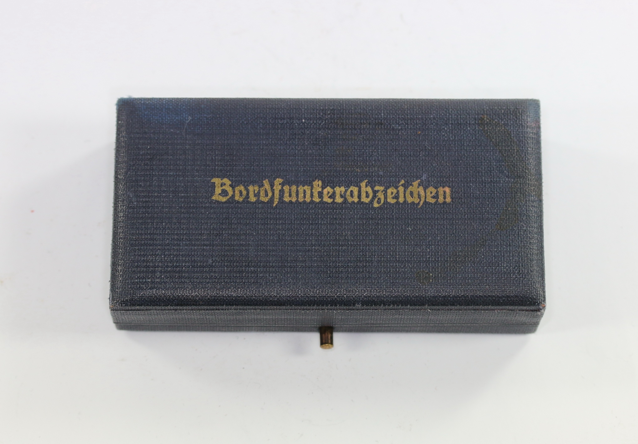 Sehr guter, nur minimal gebrauchter Zustand. Mit der für frühe Luftwaffen Etuis typischen Bespannung. Auf den Deckel in Gold eingeprägt „Bordfunkerabzzeichen“. Innen mit samt und Seide.
