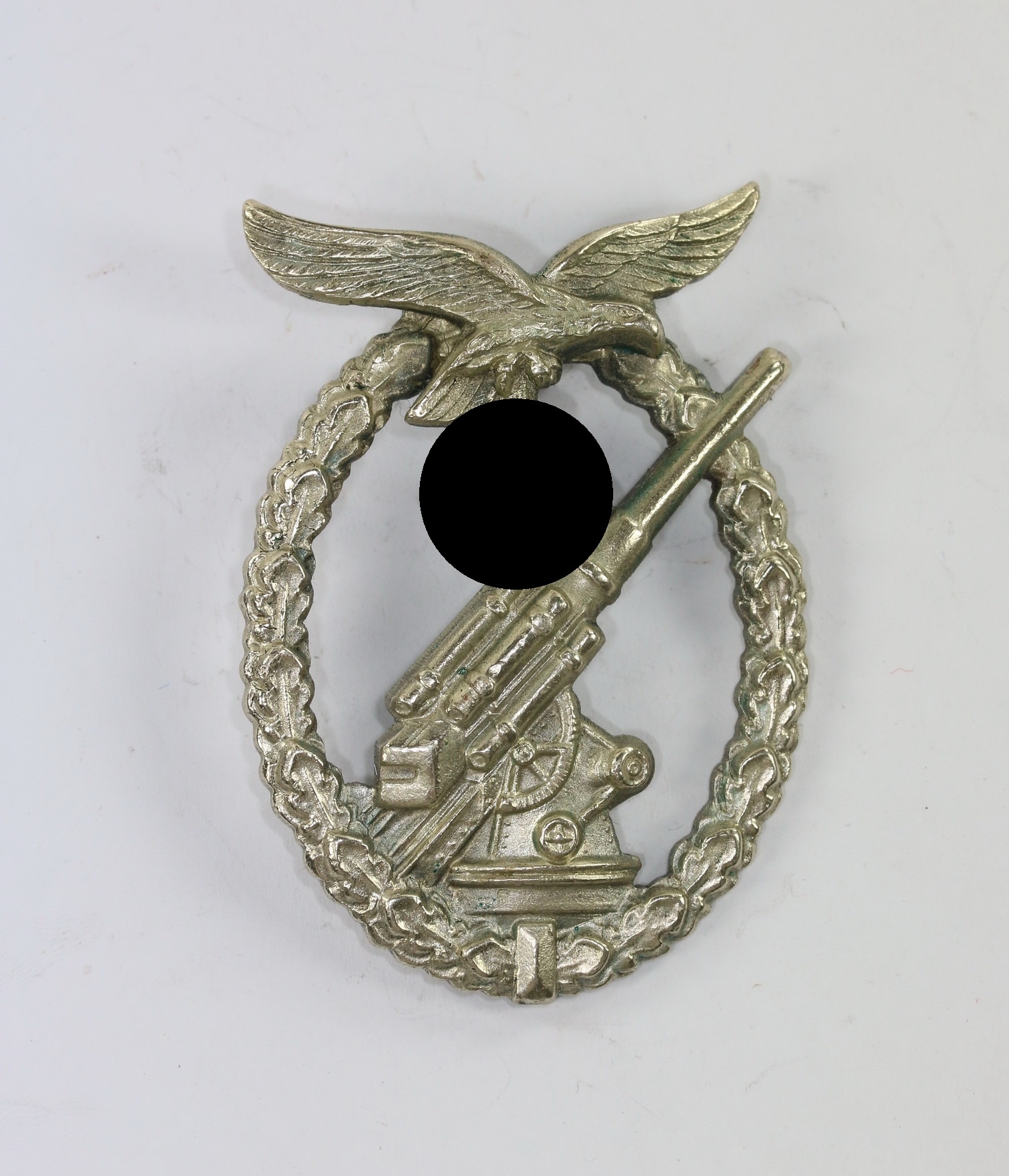 Extrem seltene Variante, aus Neusilber, ohne Hersteller und ohne Durchbruch zwischen Kanone und Kranz, siehe auch GCA-Datenbank!