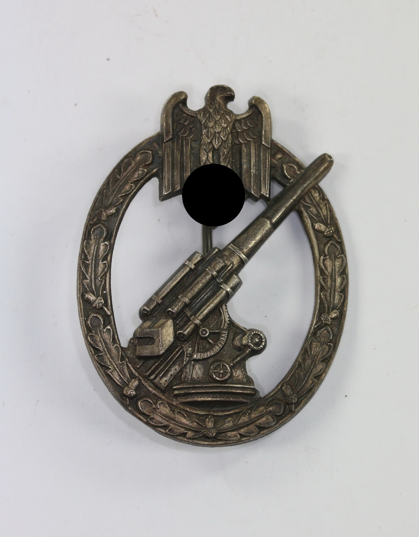 Zink, sehr guter, nahezu ungetragener Zustand. Mit vollständiger, dunkler Tönung. Ohne Hersteller, aber eine bekannte Variante der Firma C.E. Juncker, Berlin. Siehe GCA-Datenbank. Mit der typischen, markanten Platte unter den Nadelhaken.