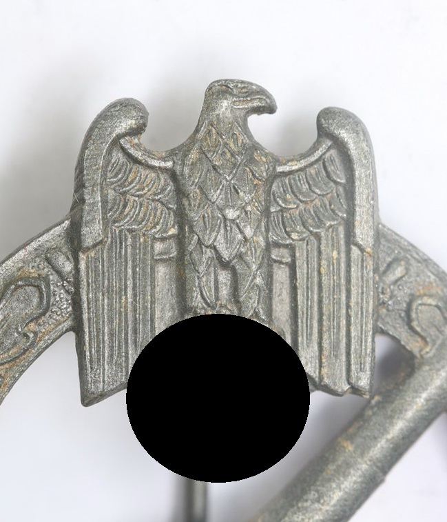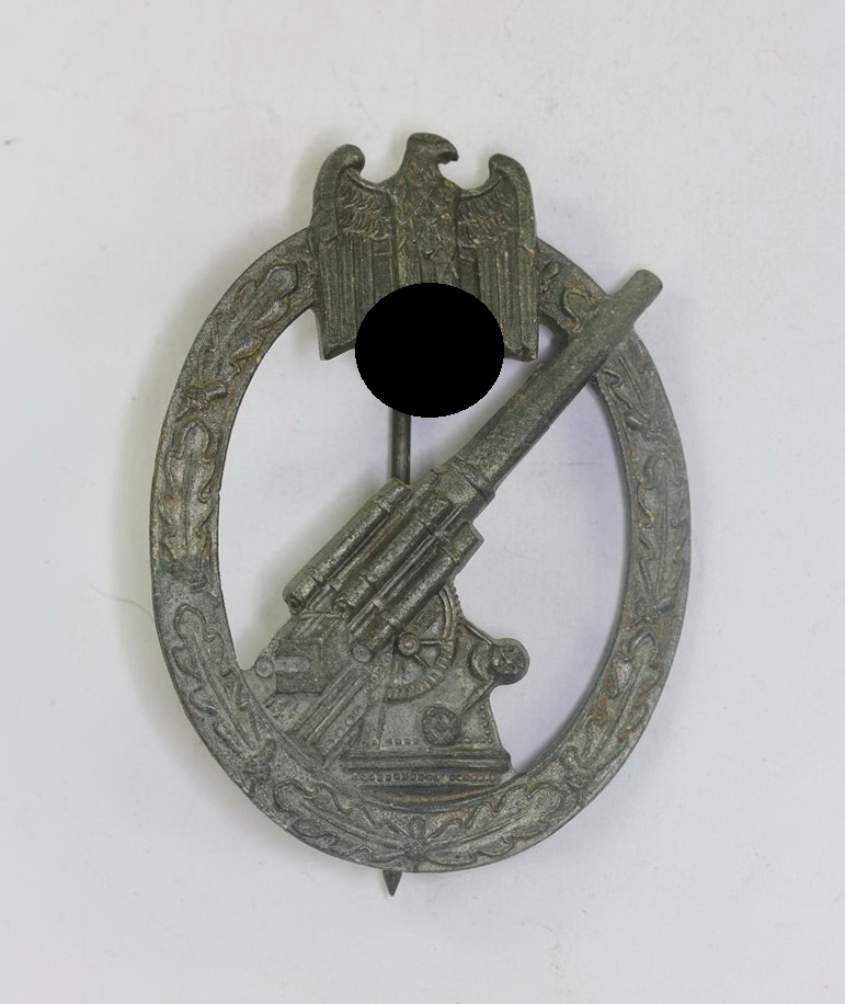 Das Flak-Kampfabzeichen aus Zink gefertigt. Sehr guter, nur leicht getragener Zustand. Mit fast vollständiger typischer Tönung. Ohne Hersteller Markierung, aber eine bekannte Variante der Firma Alois Rettenmaier aus Schwäbisch Gmünd. Auch bekannt als „Flatback“. Siehe GCA-Datenbank.