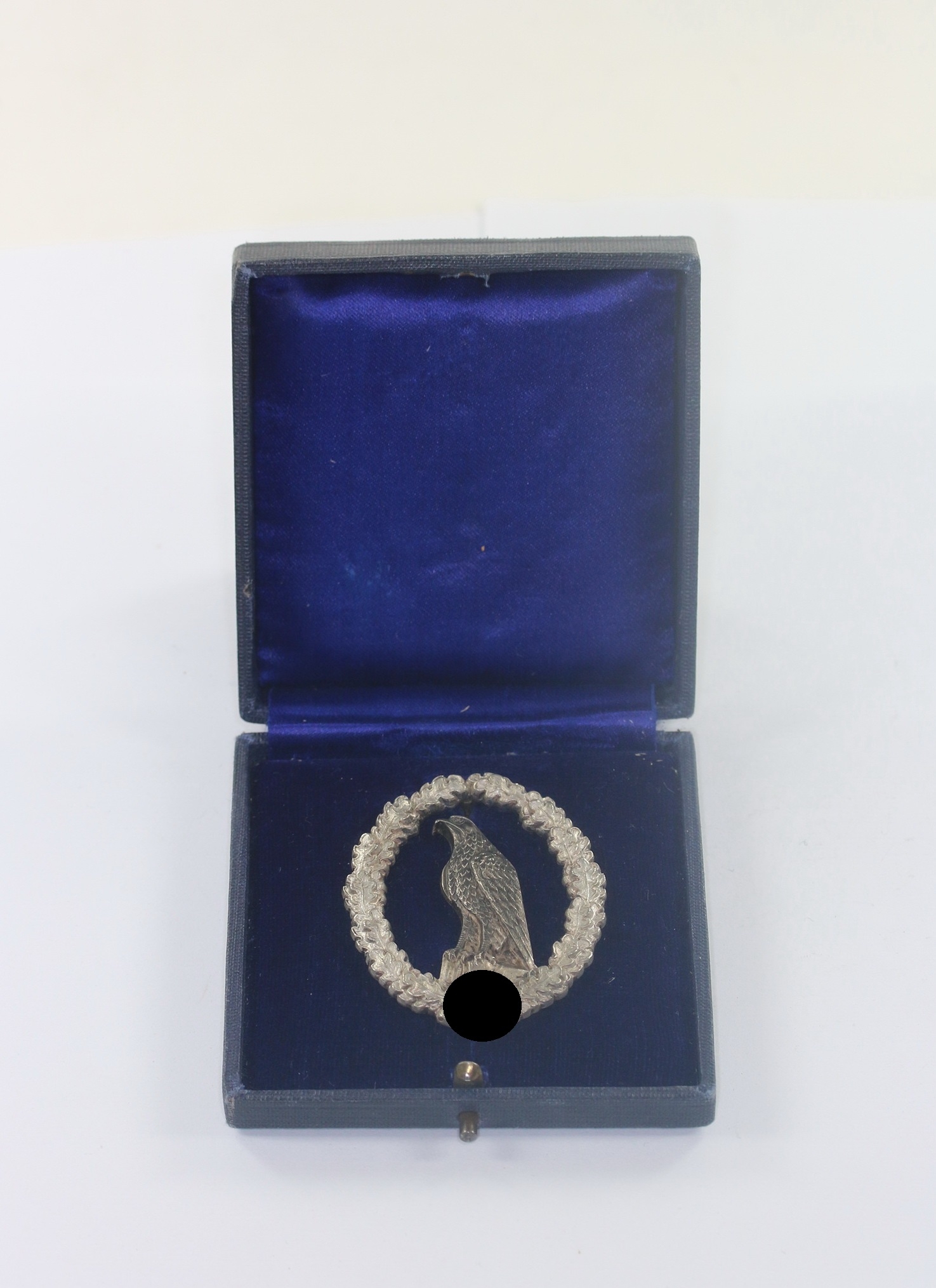 Buntmetall, sehr guter, nur minimal getragener Zustand. Der Kranz mit vollständiger, frostiger Versilberung, der Adler mit vollständiger, dunkler Tönung. Mit leichter Patina. Mit Hersteller „C.E, Juncker BerlinS.W.“. Das Abzeichen das 2. Modell (J.2) der Firma Juncker. Zu erkennen an dem sehr schön detaillierten Gefieder.