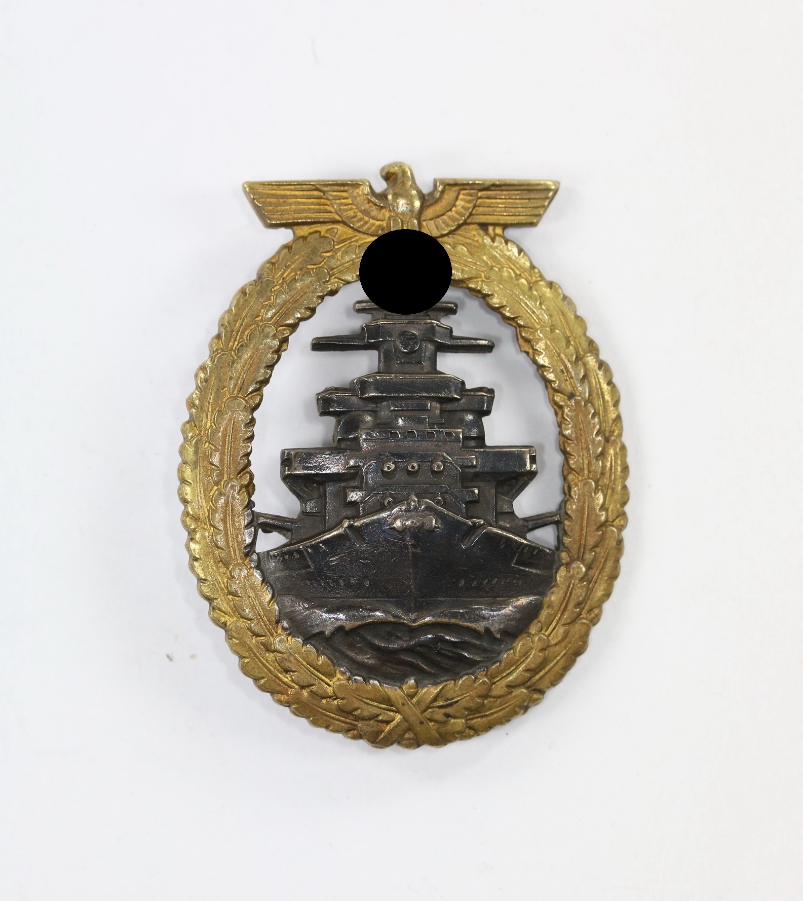Buntmetall, sehr guter, nur leicht getragener Zustand. Der Kranz mit noch sehr schöner Vergoldung. Das Schiff mit fast vollständiger Tönung. Mit Hersteller „Schwerin Berlin“, siehe Weber/Skora, Die Kriegsabzeichen der Kriegsmarine.