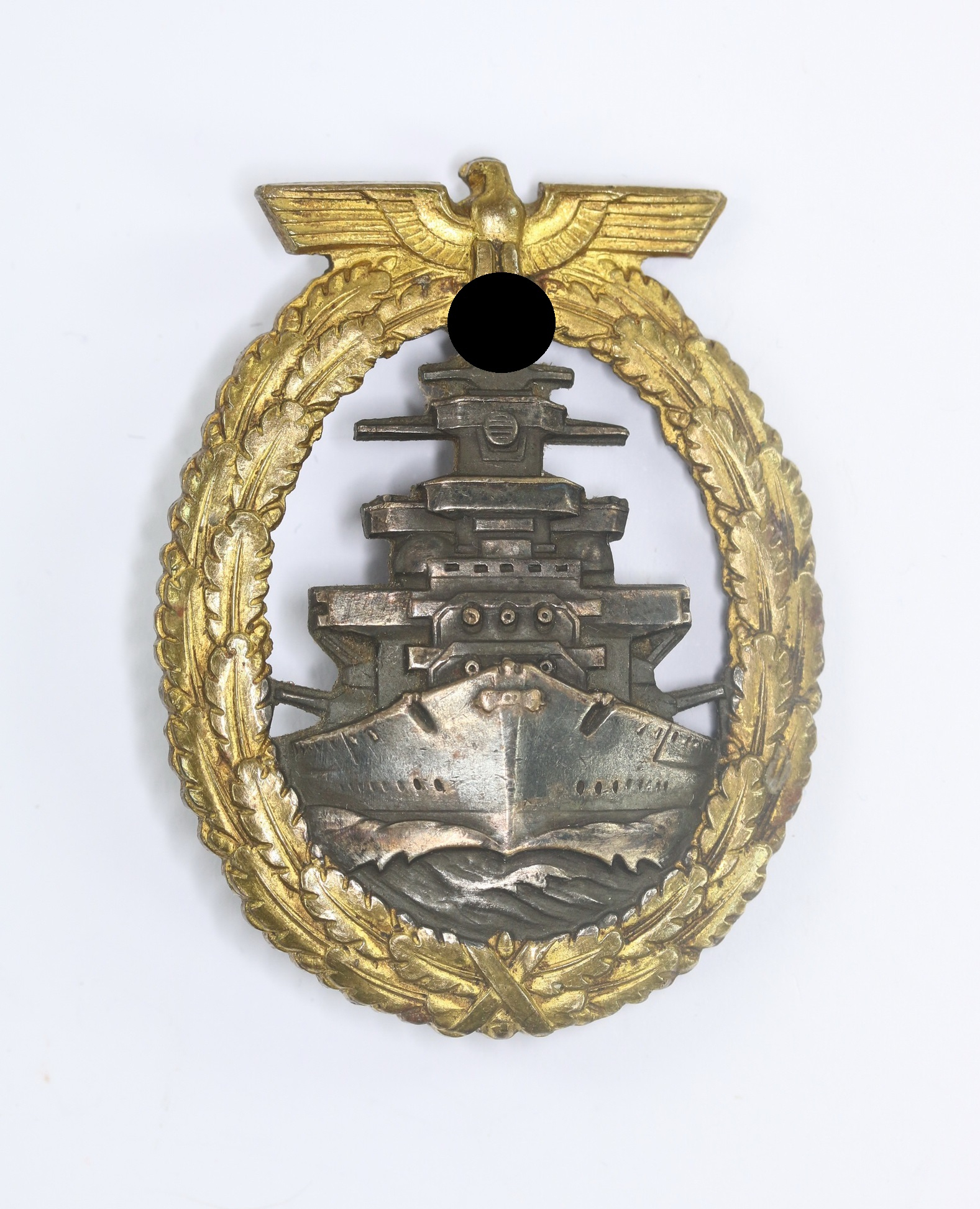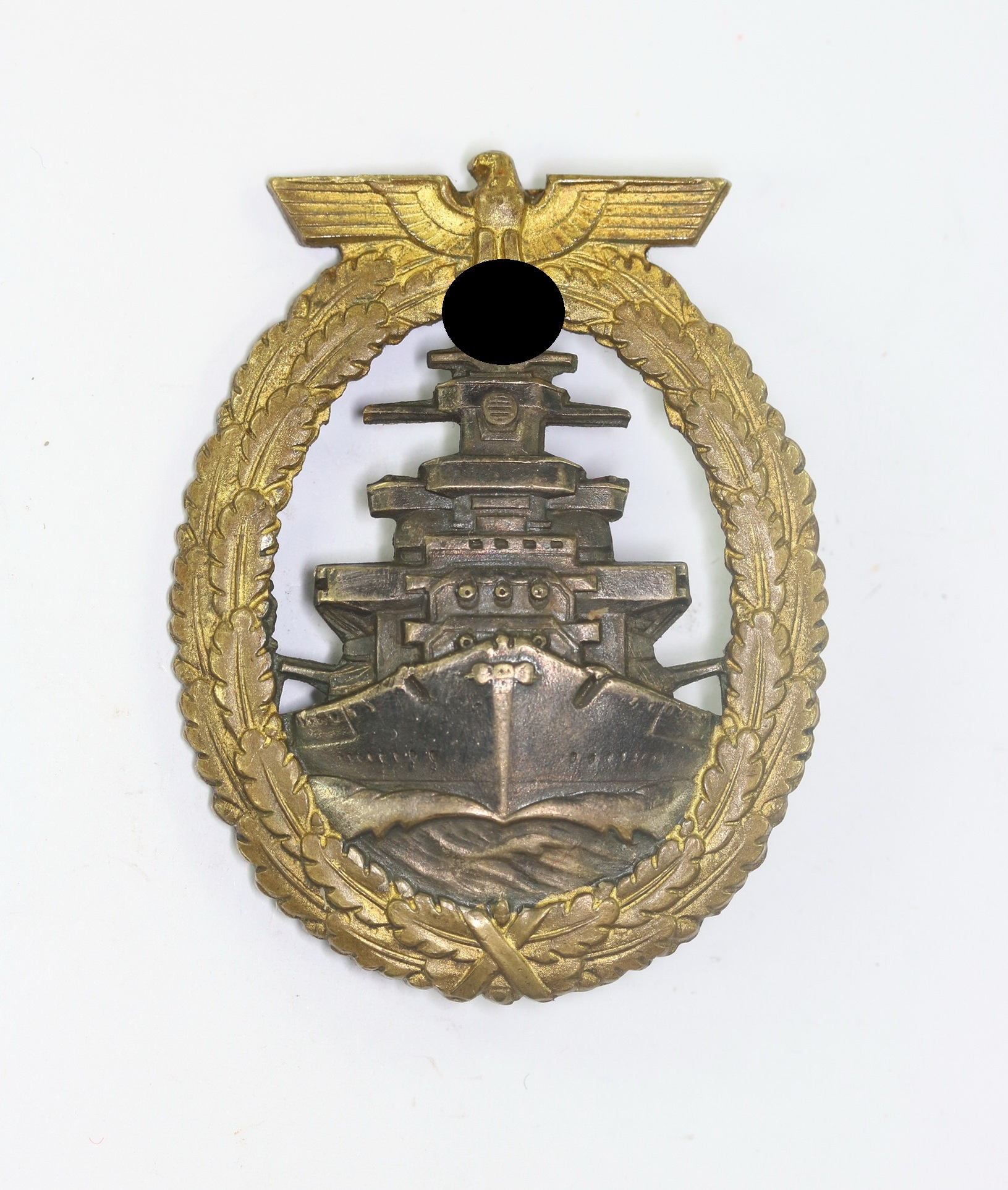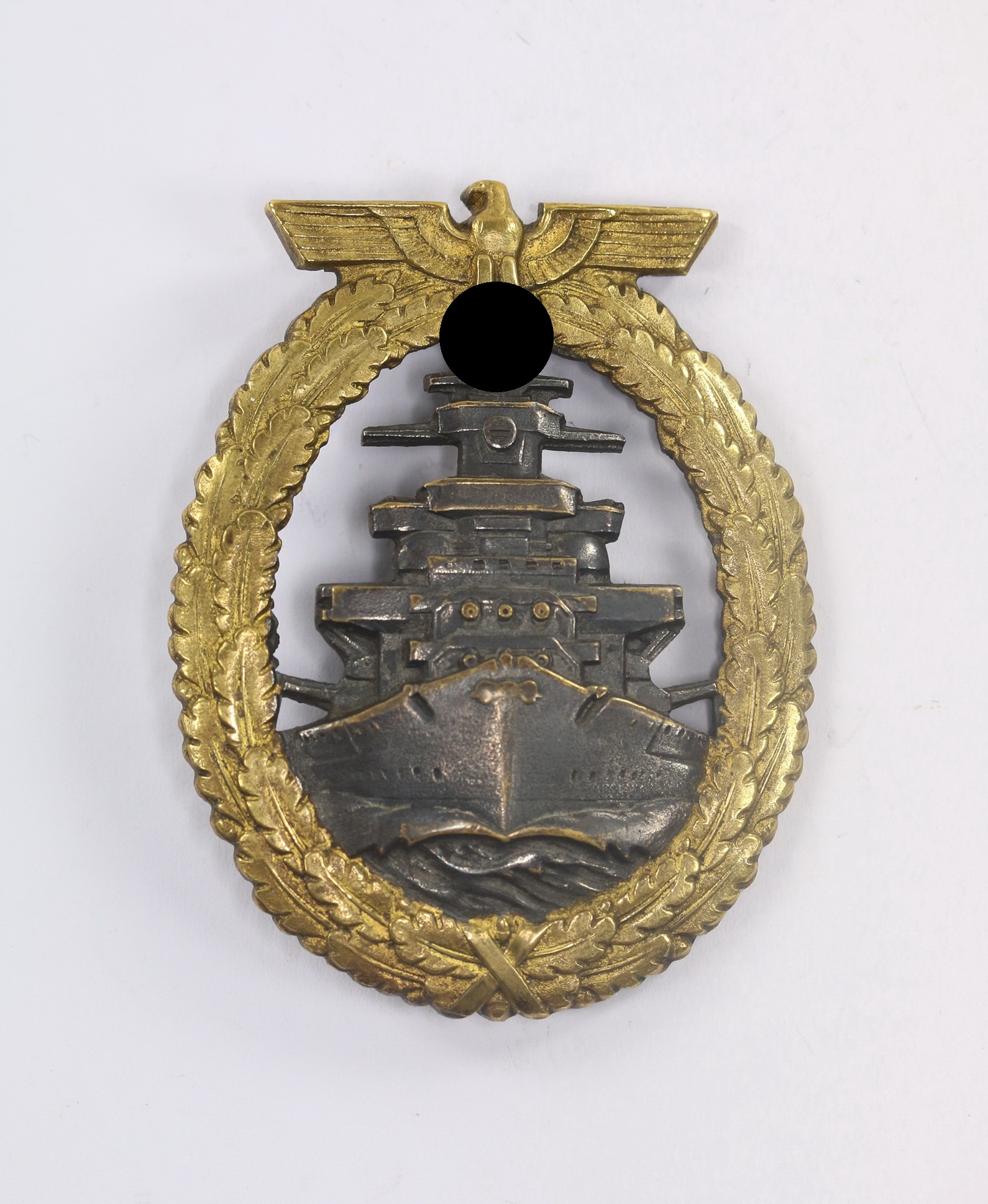 Buntmetall, sehr guter, nur leicht getragener Zustand. Das Schiff mit vollständiger, dunkler Tönung, der Kranz mit fast vollständiger Vergoldung. Frühes Abzeichen mit allen fünf Brückenfenstern und scharfen Knick auf der Rückseite. Mit Hersteller „Schwerin Berlin“, siehe GCA-Datenbank.