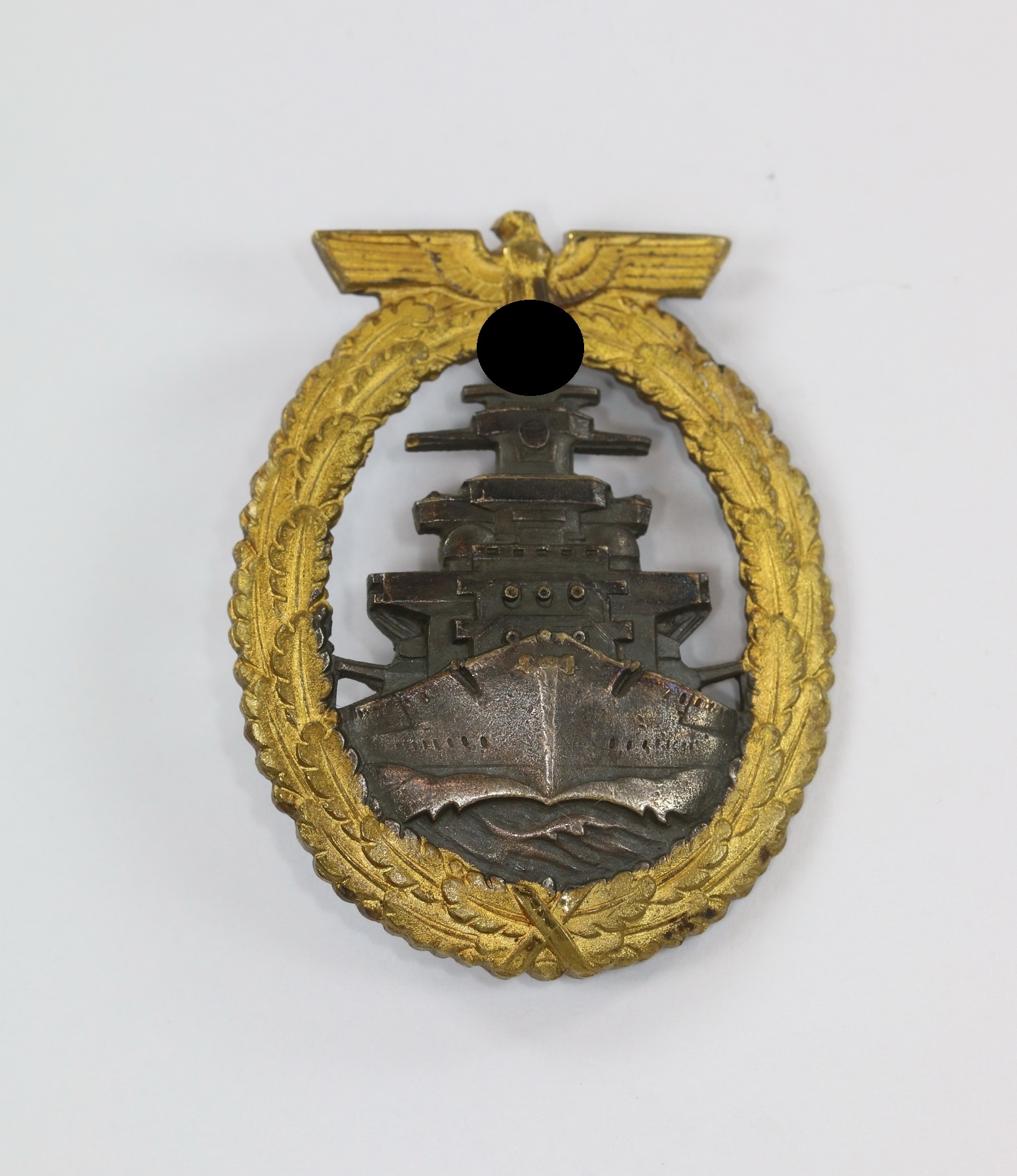 Buntmetall, excellenter, ungetragener Zustand. Das Schiff mit vollständiger, dunkler Tönung, der Kranz mit vollständiger, strahlender Vergoldung. Hakenkreuz und Kanten poliert. Frühes Abzeichen mit noch allen fünf Brückenfenstern und scharfen „Knick“ auf der Rückseite. Mit Hersteller „Schwerin Berlin“, siehe GCA-Datenbank.