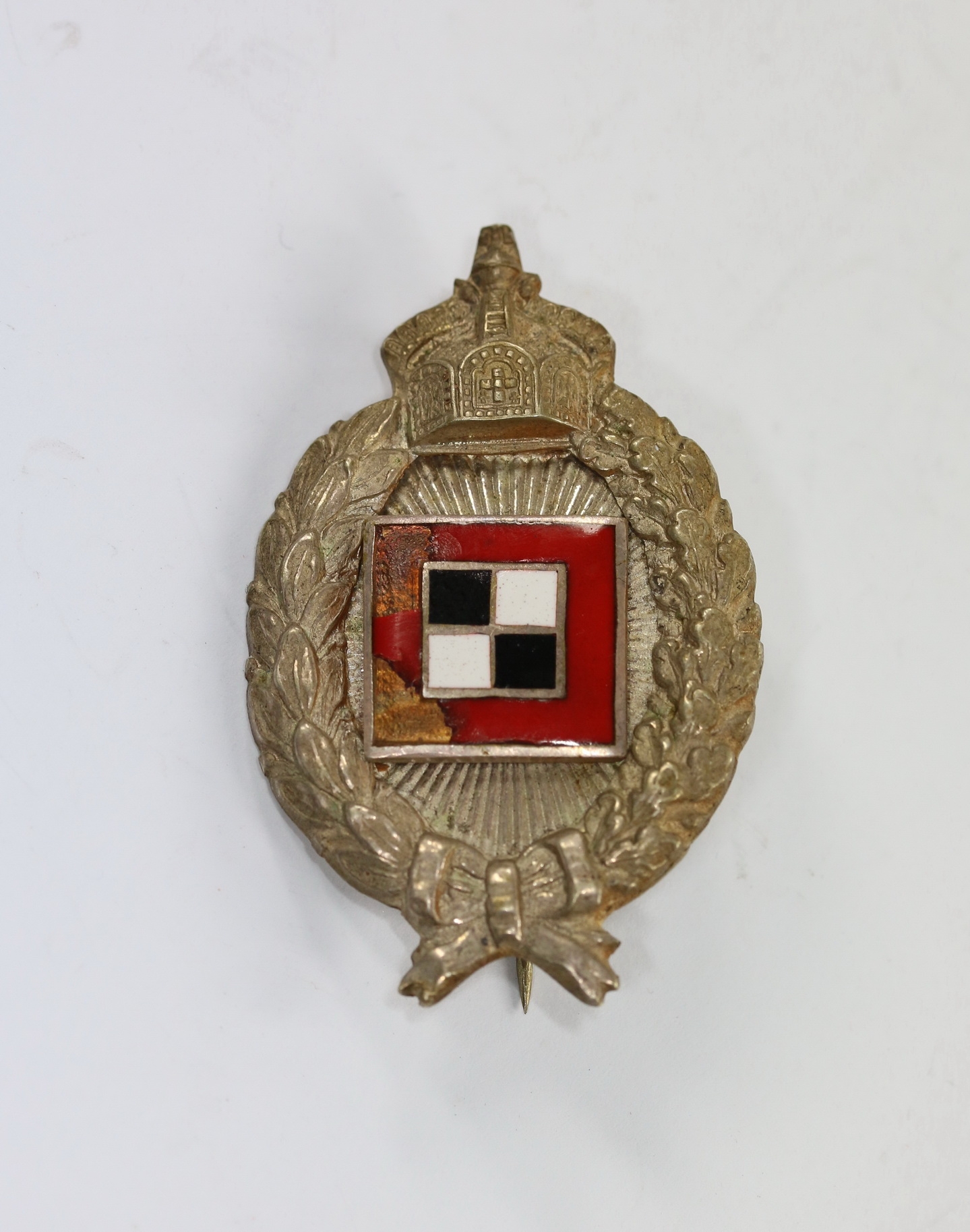 Reduktion 48 mm, hohl verbödet, die emaillierte Auflage aufgeklammert. Die emailliert Auflage mit Beschädigungen der Emaille. Sonst sehr guter, leicht getragener Zustand. Das Nadelsystem zeitgenössisch von quer auf vertikal umgebaut. Ohne Hersteller, aber eine bekannte Variante.