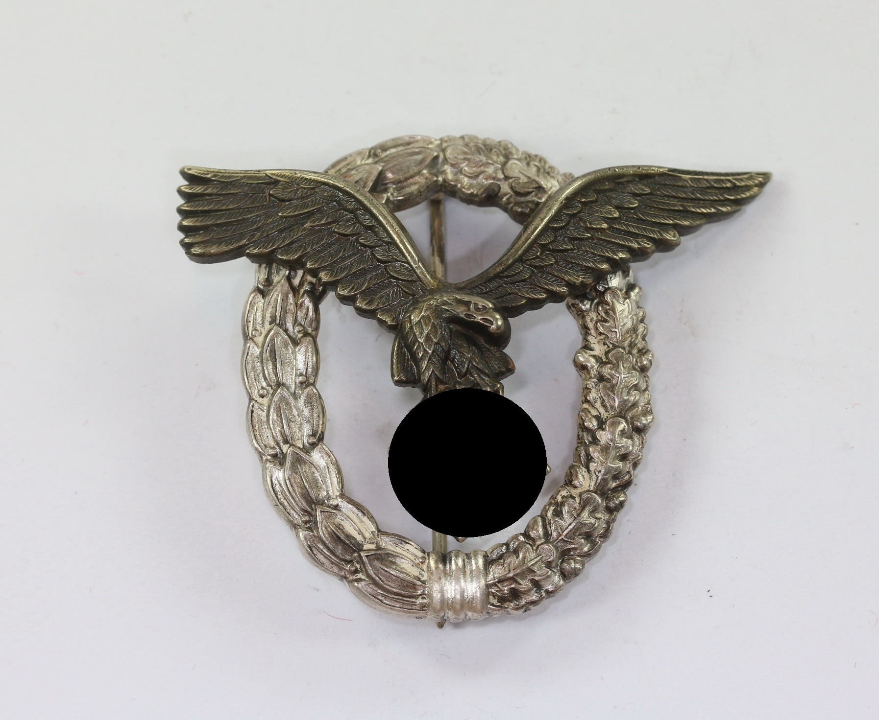 Buntmetall, sehr guter, nur leicht getragener Zustand. Der Kranz mit vollständiger Versilberung, der Adler mit vollständiger, typischer Tönung. Mit leichter Patina. Mit Hersteller „GWL“ für die Firma Gebrüder Wegerhoff, Lüdenscheid.