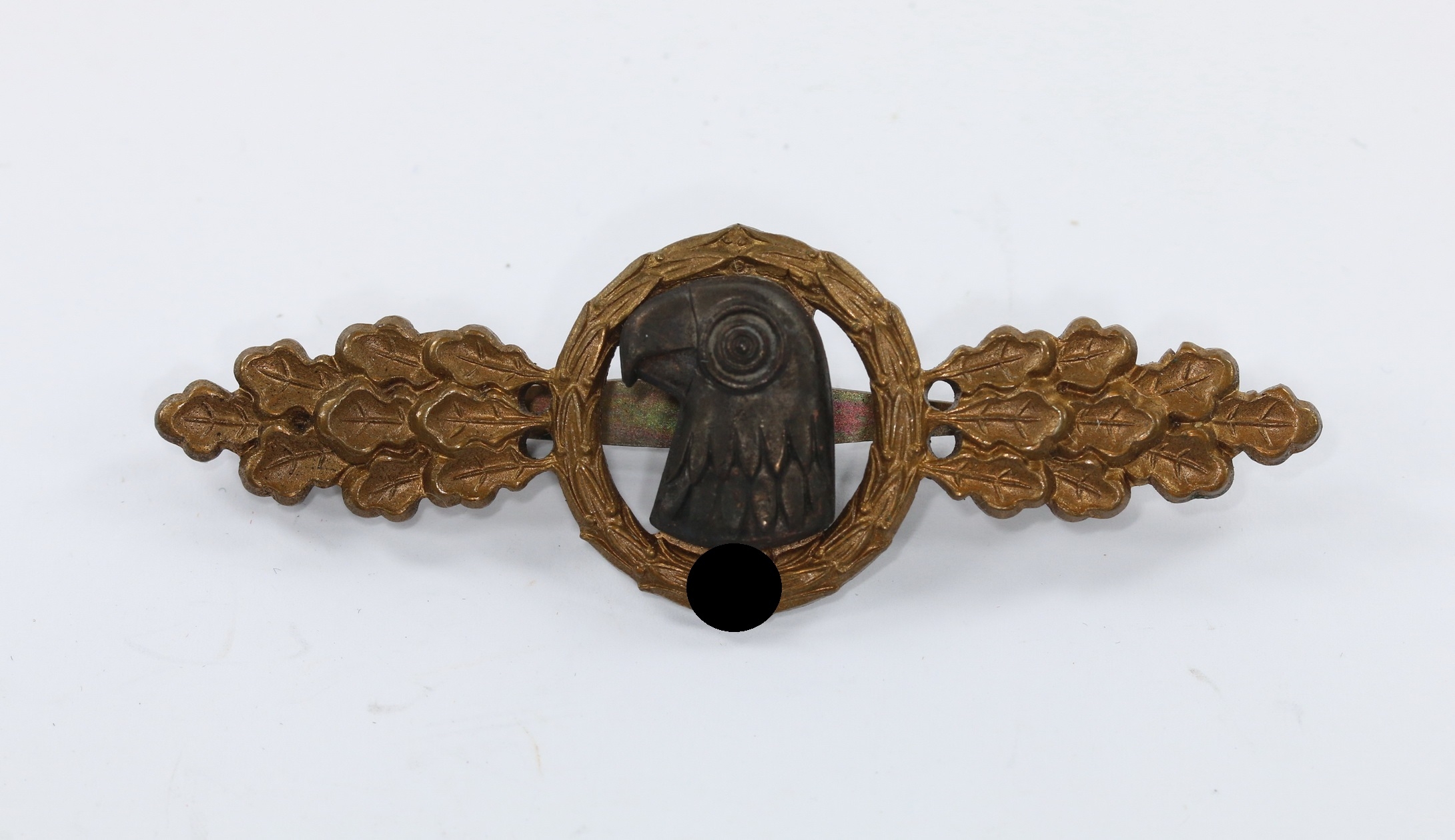 Buntmetall, excellenter, unungetragener Zustand. Mit vollständiger Bronzierung. Die Auflage mit vollständiger dunkler Tönung. Ohne Hersteller, aber eine bekannte Variante, die der Firma Friedrich Linden, Lüdenscheid (FLL) zugeordnet wird.