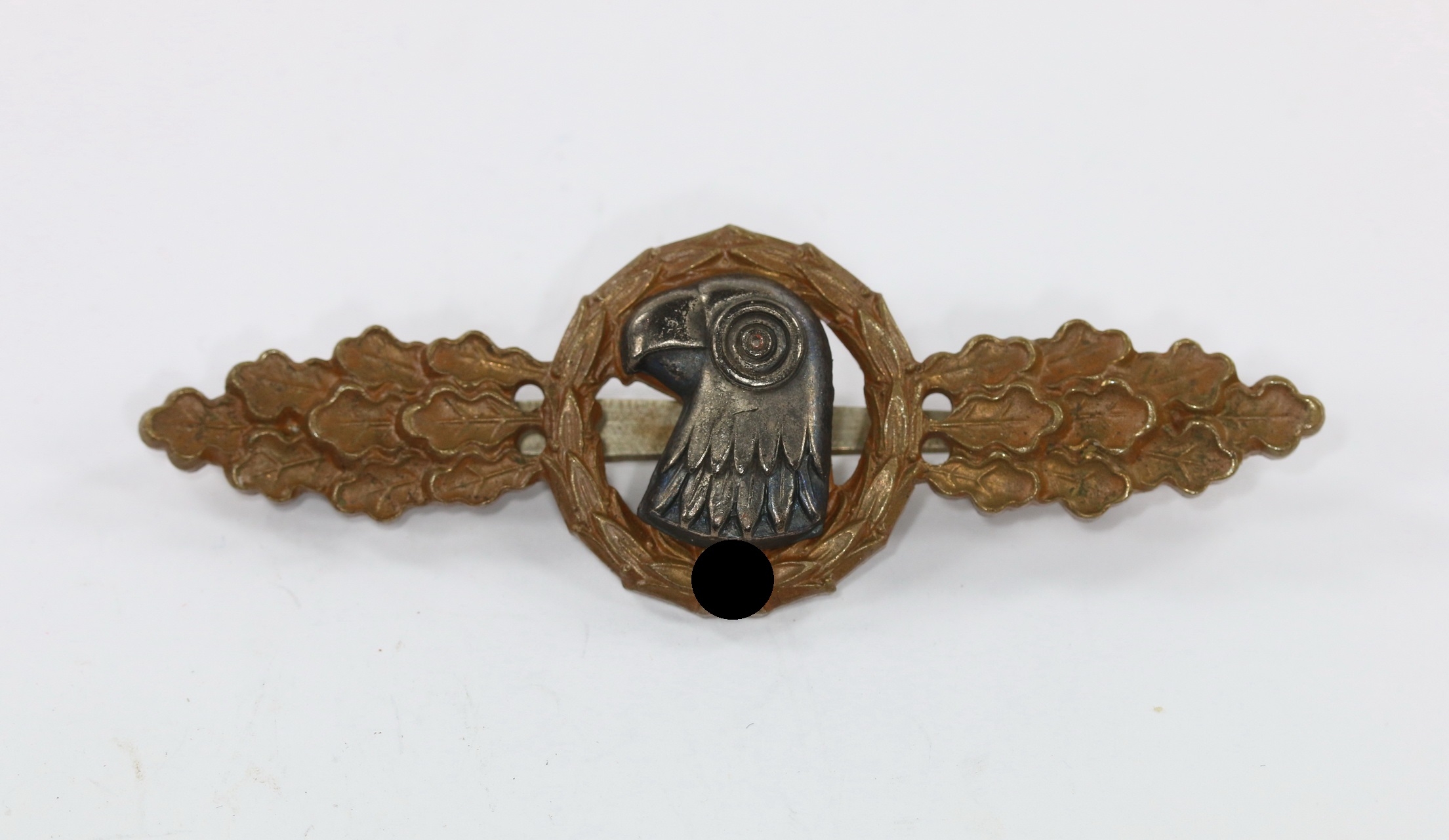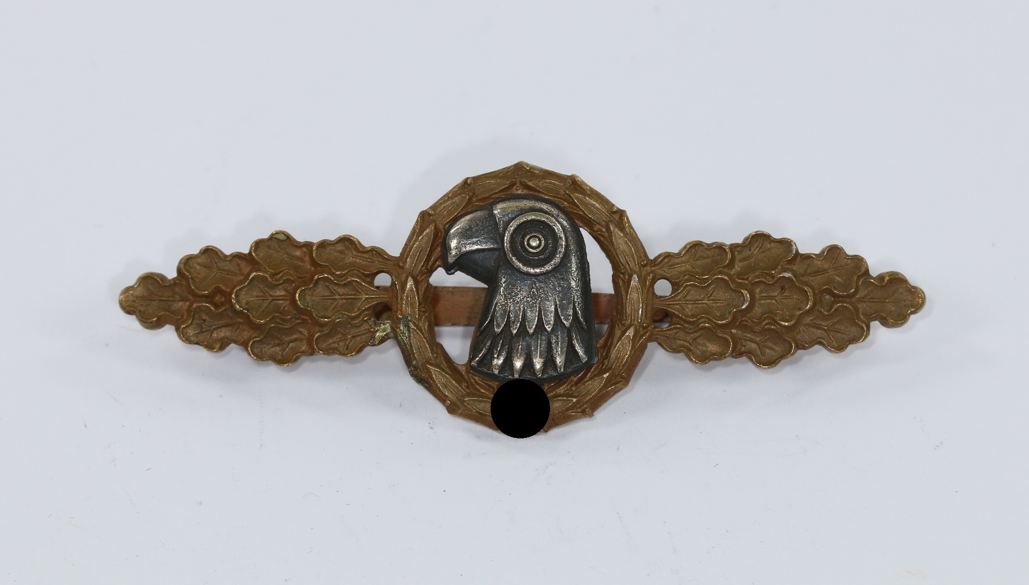 Buntmetall, sehr guter, nur minimal getragener Zustand. Die Spange mit vollständiger Bronzierung, die Auflage mit fast vollständiger Schwärzung. Ohne Hersteller, aber eine bekannte Variante.