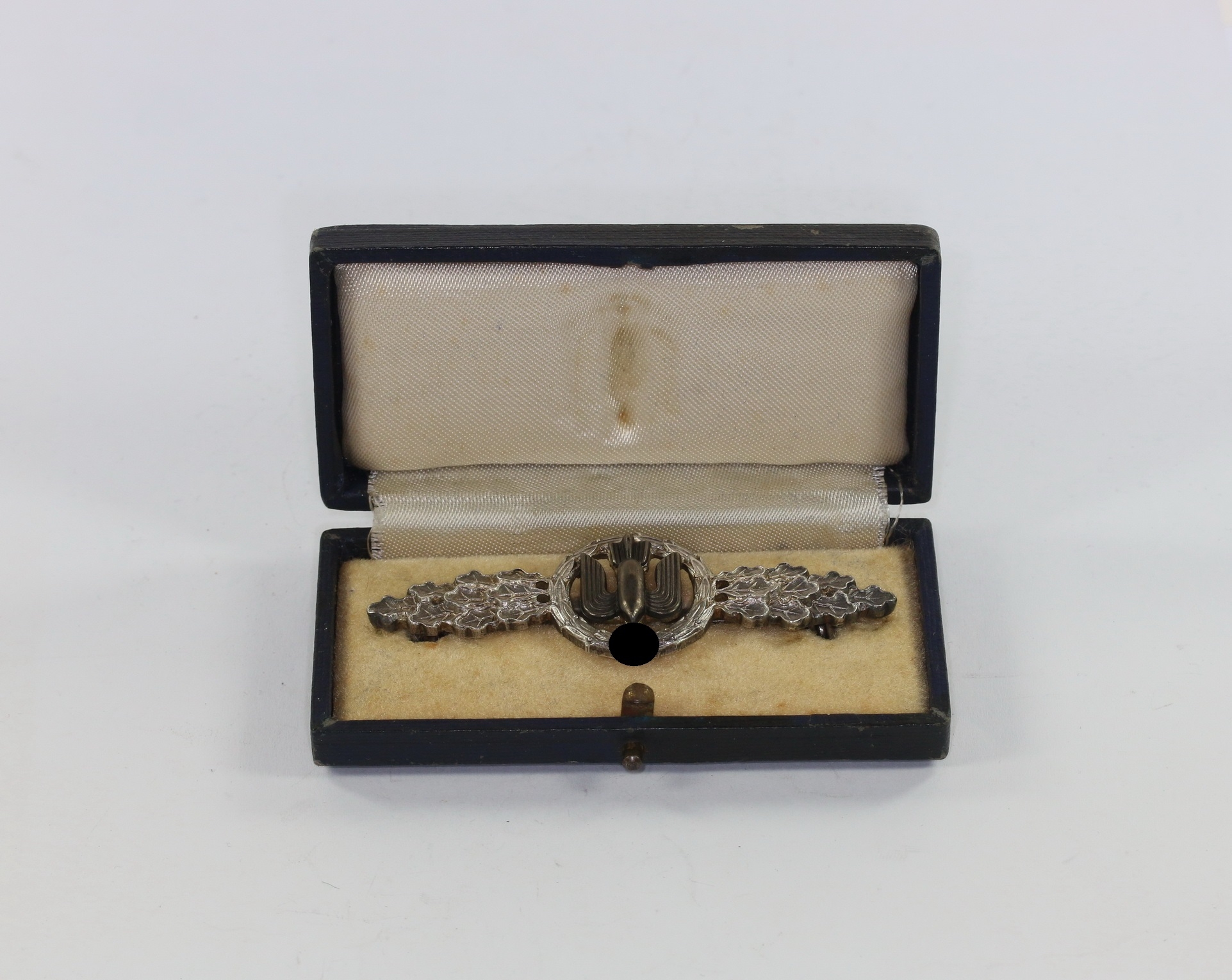 Im zugehörigen Etui. Das Etui in einen sehr guten, nur leicht gebrauchten Zustand. Auf den Deckel in Gold „Frontflugspange für Kampfflieger silber“.