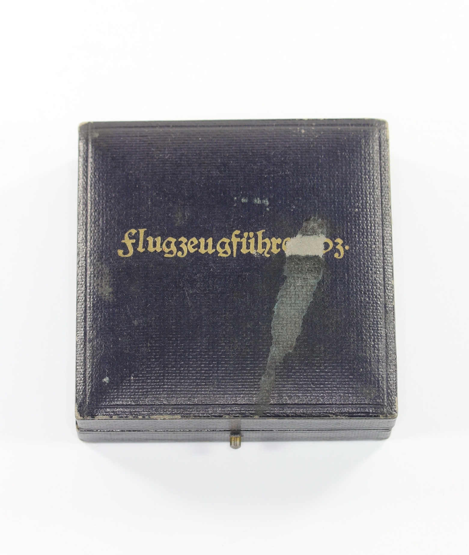 Frühes Etui in sehr guter, leicht gebrauchten Zustand. Innen mit Samt und Seide. Auf den Deckel in Gold eingeprägt „Flugzeugführerabz.“. Ganz frühes Etui für flache Abzeichen von Deumer, oder Assmann.