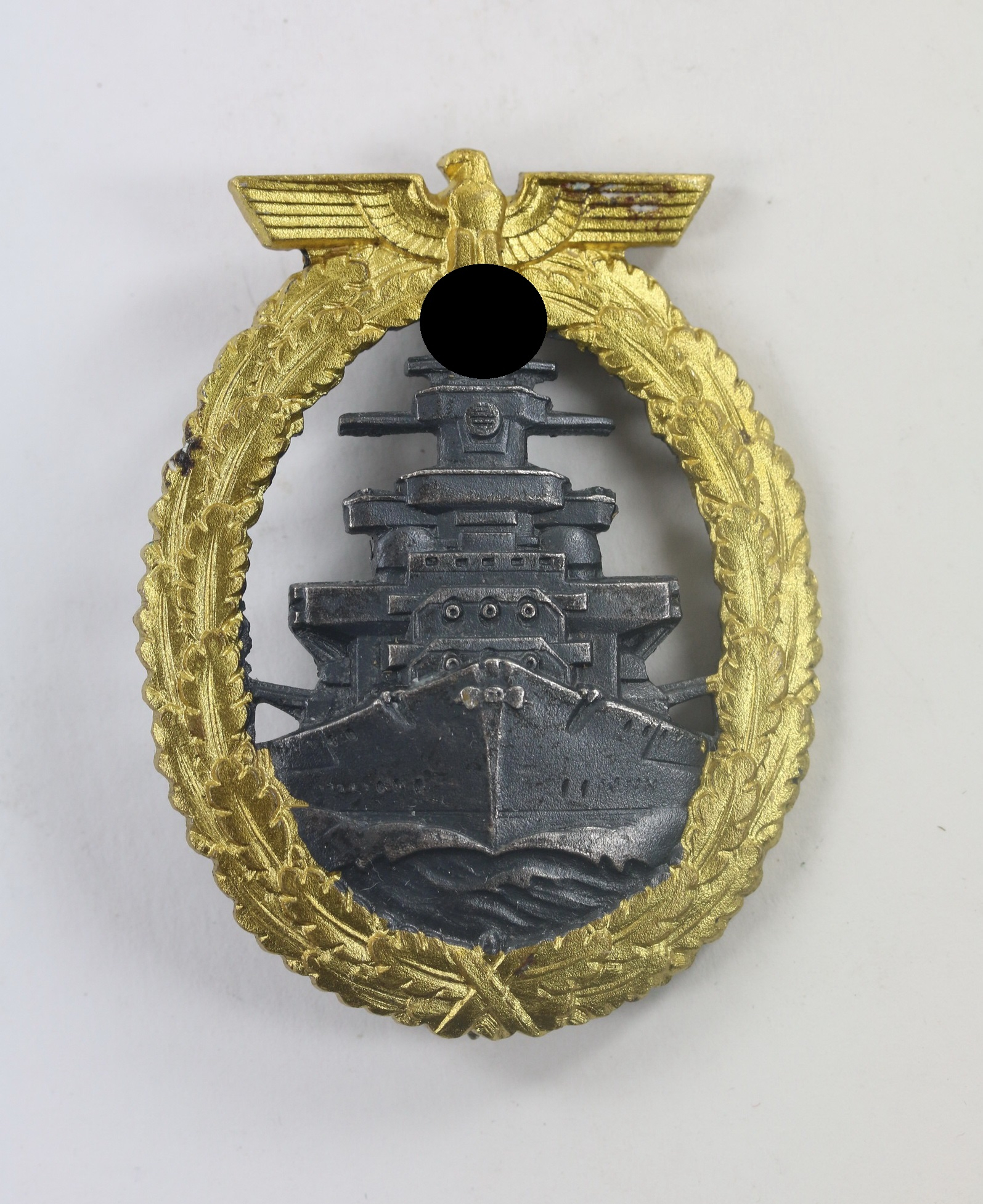 Buntmetall, excellenter, ungetragener Zustand. Das Schiff mit vollständiger, dunkler Tönung, der Kranz mit vollständiger, strahlender Vergoldung. Hakenkreuz und Kanten poliert. Frühes Abzeichen mit noch allen fünf Brückenfenstern. Mit Hersteller „Schwerin Berlin“, siehe GCA-Datenbank.