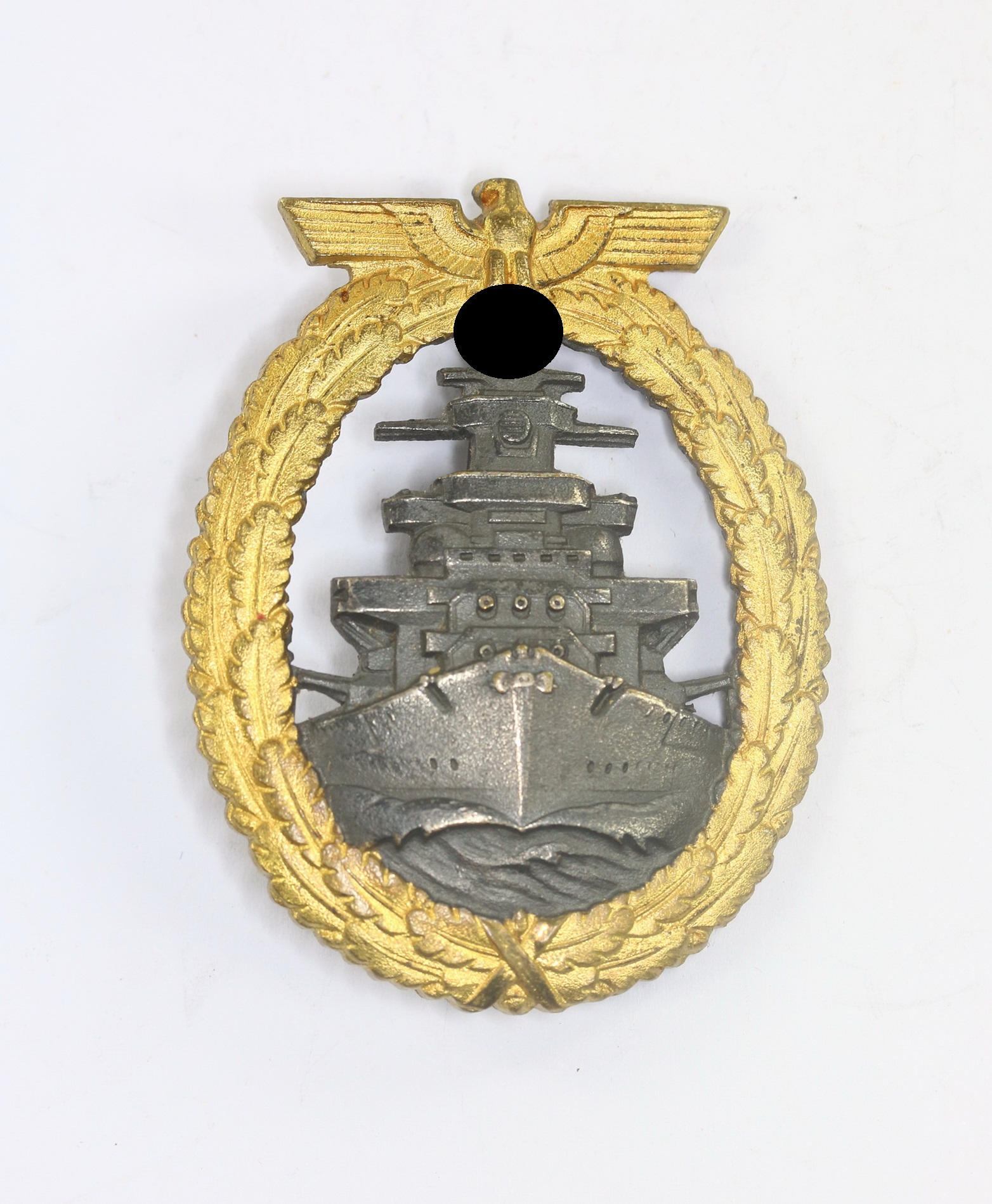 Excellenter, ungetragener Zustand. Das Schiff mit vollständiger, dunkler Tönung, der Kranz mit vollständiger, strahlender Vergoldung. Hakenkreuz und Kanten poliert. Frühes Abzeichen mit noch allen fünf Brückenfenstern und den scharfen „Knick“ auf der Rückseite. Mit Hersteller „Schwerin Berlin“, siehe GCA-Datenbank.