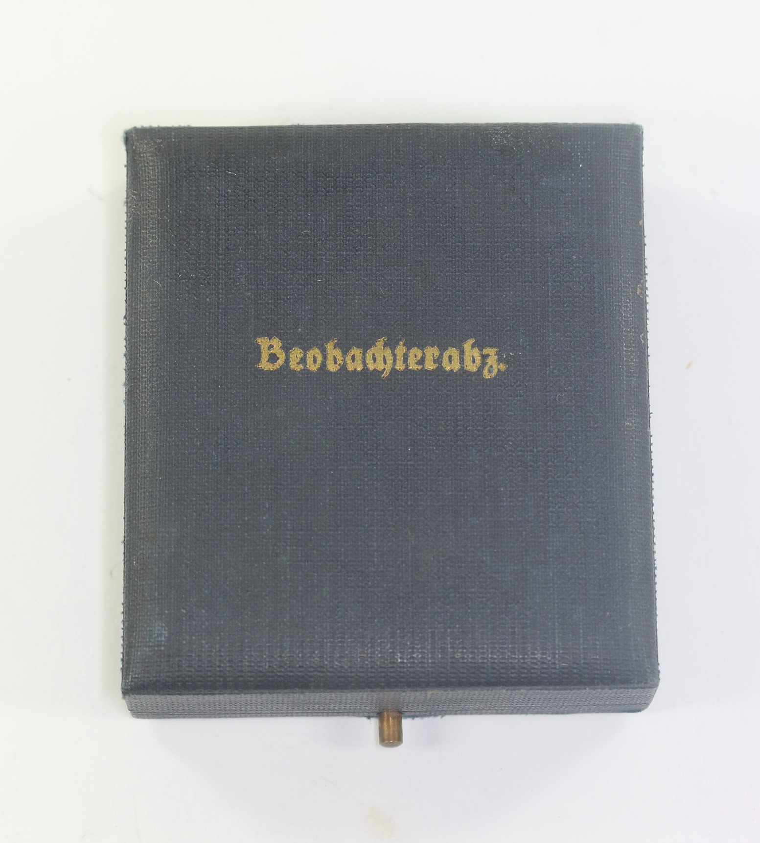 Sehr guter, nur minimal gberauchter Zustand. Mit der für ganz frühe Etuis typischen Bespannung. Innen mit Samt und Seide. Auf den deckel in Gold eingeprägt „Beobachterabz.“. Kleine Ausfrührung Maße ca. 75 x 65 x 20 mm. Für frühe flache Abzeichen.