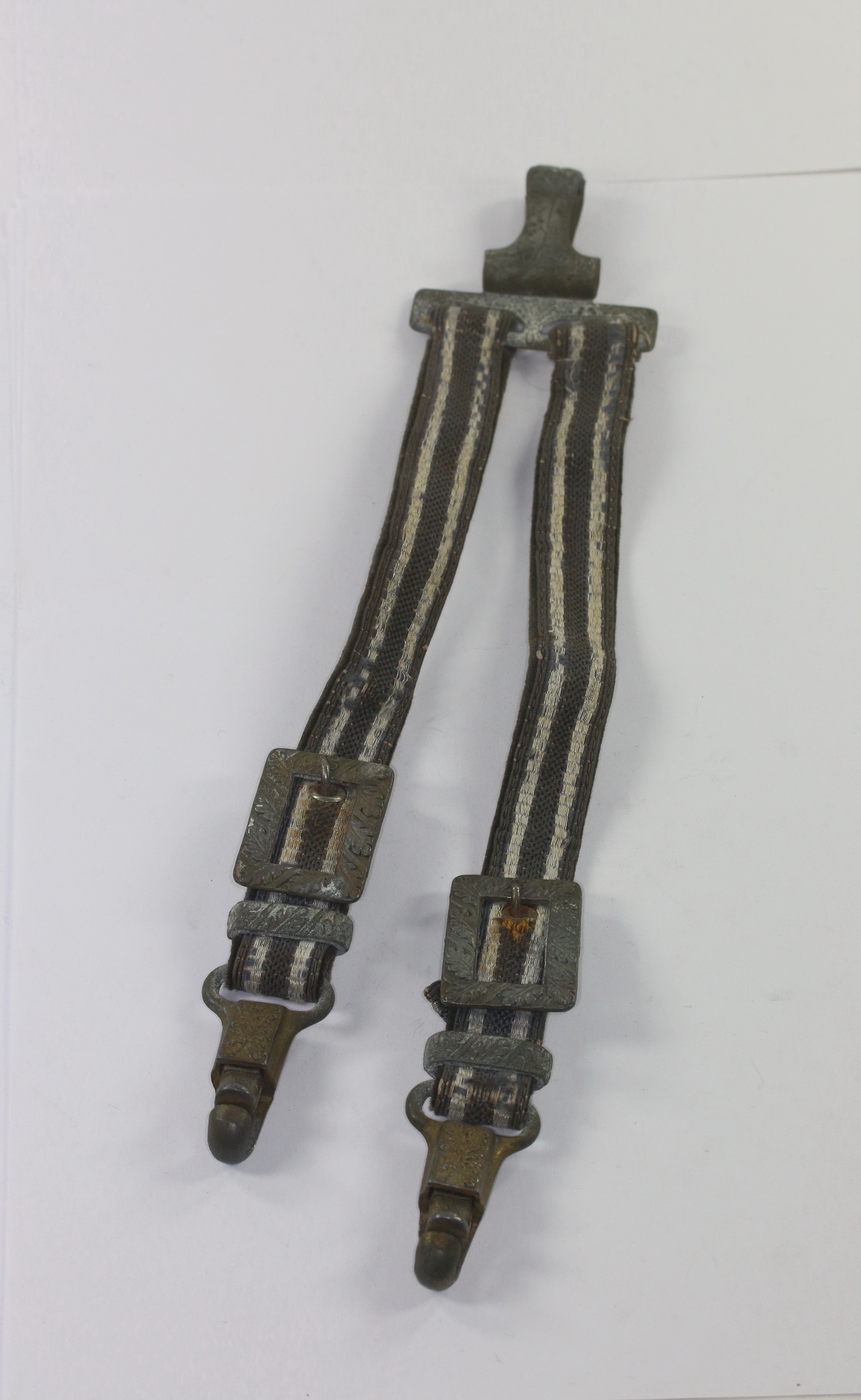 Sehr guter, leicht getragener Zustand. Vollständig und funktionsfähig, die Riemen mit Samt unterfüttert.