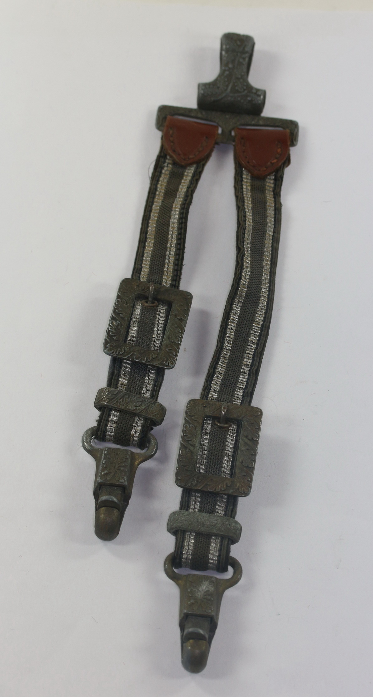 Sehr guter, nur leicht getragener Zustand. Vollständig und funktionsfähig, die Riemen mit Samt unterfüttert.