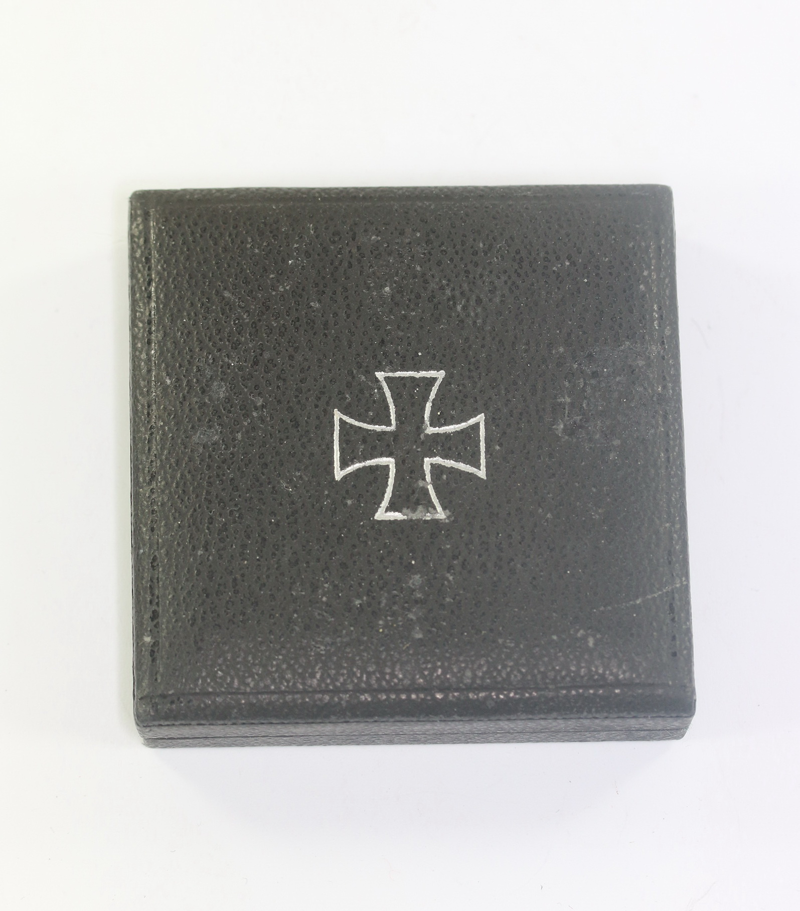 Sehr guter, leicht gebrauchter Zustand. Sogenanntes Halbetui (ohne Drücker). Auf den flachen Deckel mit in Silber eingeprägten Eisernen Kreuz. Typisches, spätes Etui.