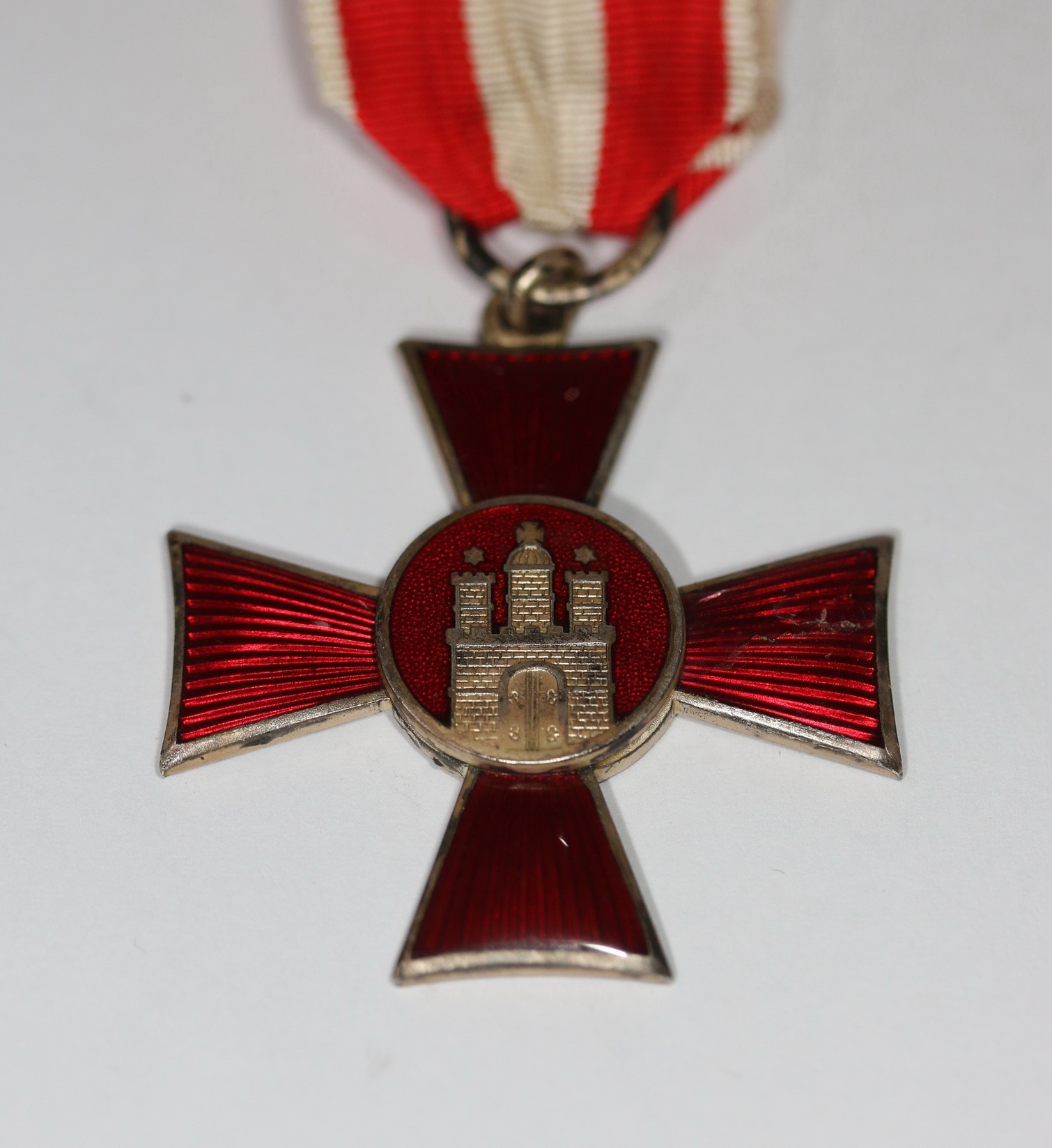 Buntmetall, emailliert, die Emaille am rechten Kreuzarm leicht beschädigt, sonst sehr guter Zustand.