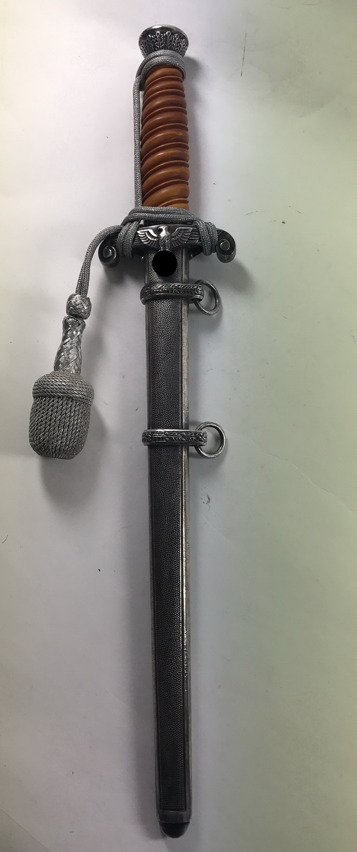 Sehr guter, nur minimal getragener Zustand. Der orange fast rote Griff ohne Fehler. Knauf und Parierstange in einen sehr guten Zustand, mit vollständiger Versilberung und schöner Patina. Die Scheide aus versilberten Eisen, ohne Fehler. Mit unberührter Patina. Die Klinge blank und fehlerfrei. Darauf der Hersteller „Gebr. Heller Marienthal b. Schweima/THR.“ (Ballon Mann). Mit original gebundenen Portepee.